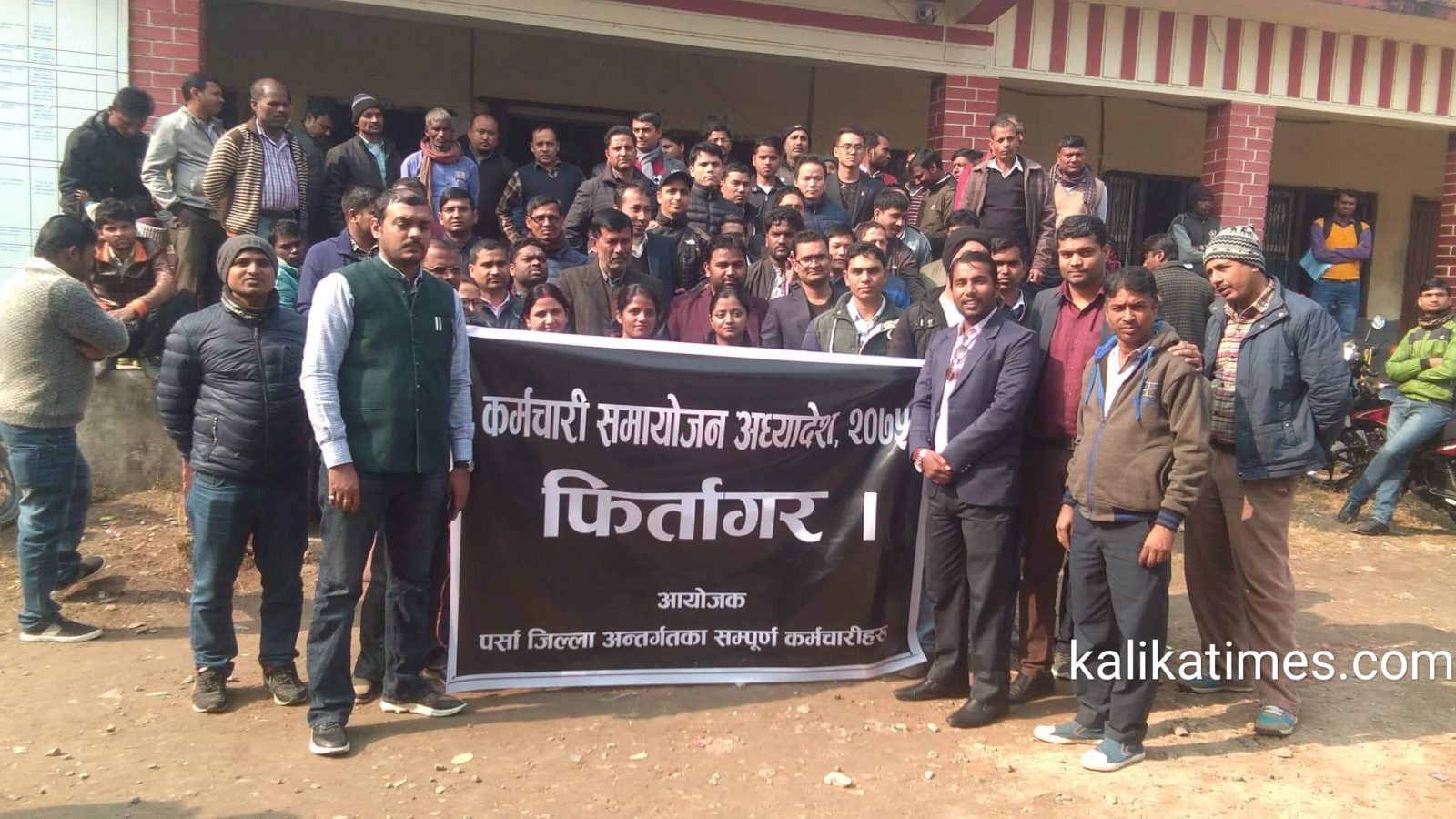 पर्सा जिल्लाका कर्मचारीहरुले कर्मचारी समायोजन अध्यादेश २०७५ फिर्ताको माग गर्दौ आज जिल्ला प्रशासन कार्यालय पर्सा घेराउ गर्दै एक घण्टा धर्ना दिएका छ्न ।