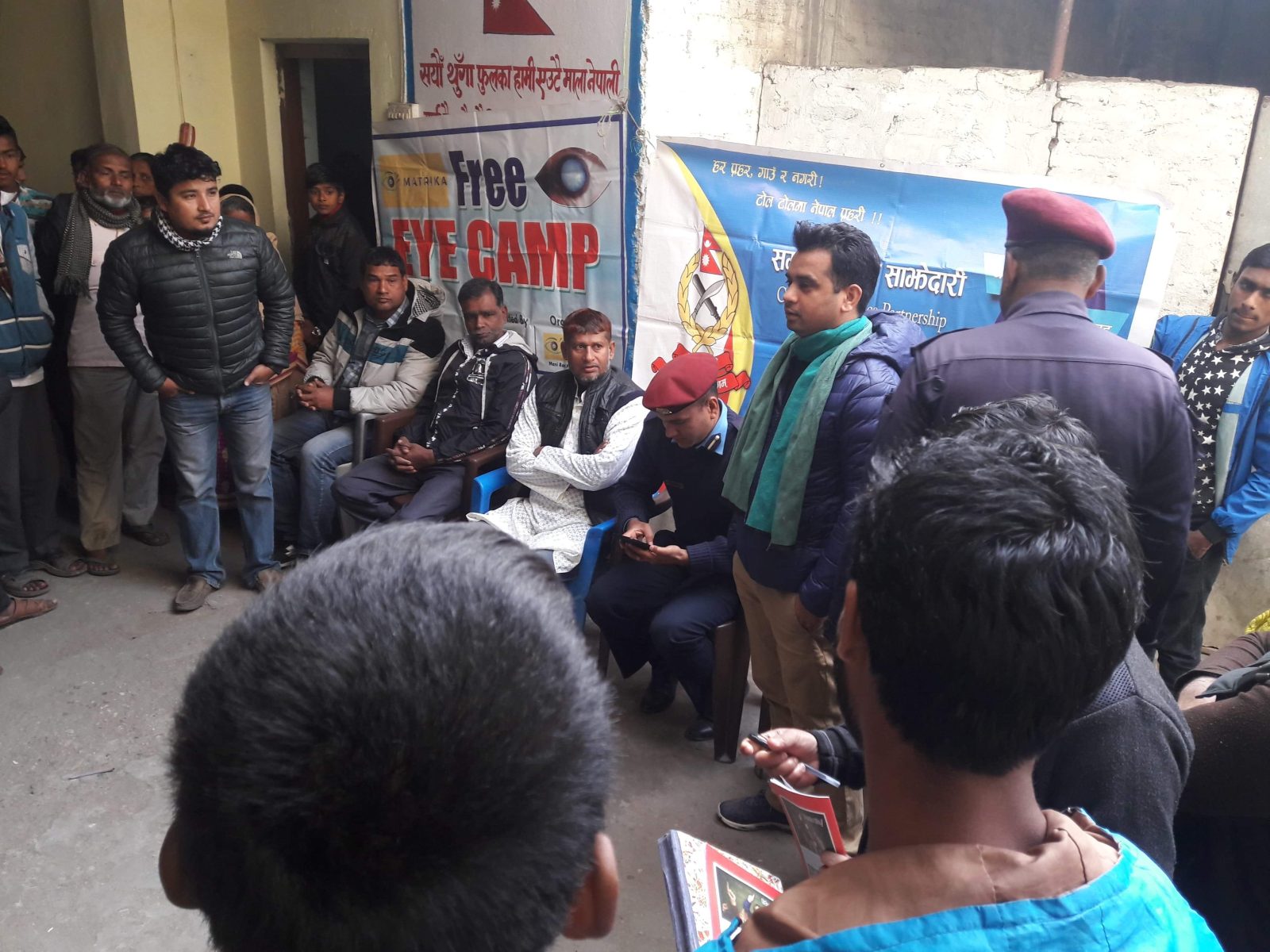 क्लबका अध्यक्ष समसाद अलीको अध्यक्षतामा र वड़ा प्रहरी कार्यालय श्रीपुरका प्रहरी निरीक्षक चक्र बहादुर मल्लको प्रमुख आतिथ्य भएको कार्यक्रममा सामाजिक अभियन्ता समाज सेवी अबुलेश अंसारी लगायतको उपस्थिति रहेको थिय। कार्यक्रमका प्रमुख अतिथी प्र.नि. चक्रमल्लको आँखा चेक जांच गरी शिविर सुरु भएको थियो ।