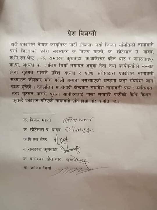 पर्सा जिल्ला समितिले हालै प्रकाशीत नामावली प्रति नेकपा जिल्लका प्रदेश सदस्यहरुबाट घोर आपत्ति जनाएका छन् ।प्रकाशित नामावली प्रति नेपाल कम्युनिस्ट पार्टी (नेकपा) जिल्लाका प्रदेश सदस्य विजय महतो,छोटेलाल प्रसाद यादव,पि.एल.श्रेष्ठ,रामदरश कुशवाहा,वालेश्वर दहैत थारु र जालीम मियाँ लगायतको सहभागीतामा विज्ञप्ती जारी गरीएको छ ।