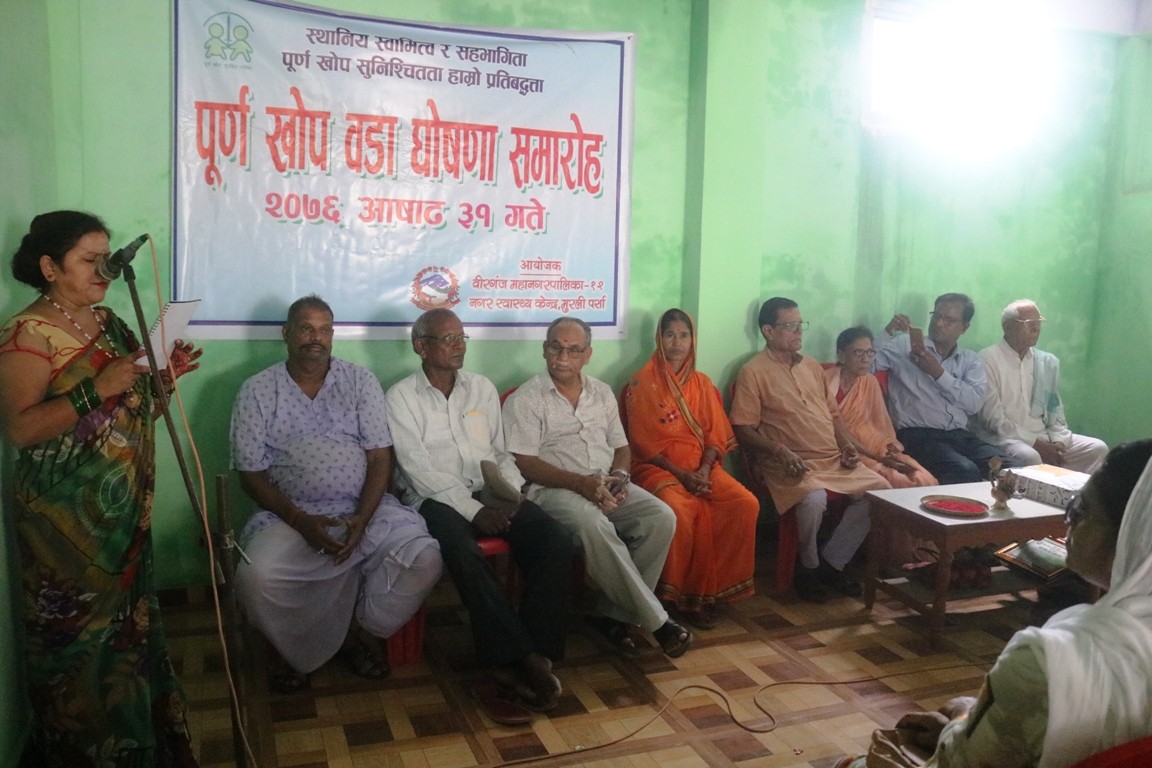 वीरगंज महानगरपलिका वडा नम्बर १२ पूर्ण खोप वडा घोषण भएको छ ।स्थानिय स्वामित्व र सहभागिता पूर्ण खोप सुनिश्चितता हाम्रो प्रतिब्द्धताको नाराका साथ मंगलबार महानगरपलिका वडा नम्बर १२ पूर्ण खोप वडा घोषण गरिएको हो । वीरगंज महानगरपलिका वडा नम्बर १२ का नगर स्वास्थ्य केन्द्र मुर्लीको आयोजनामा गरीएको छ ।