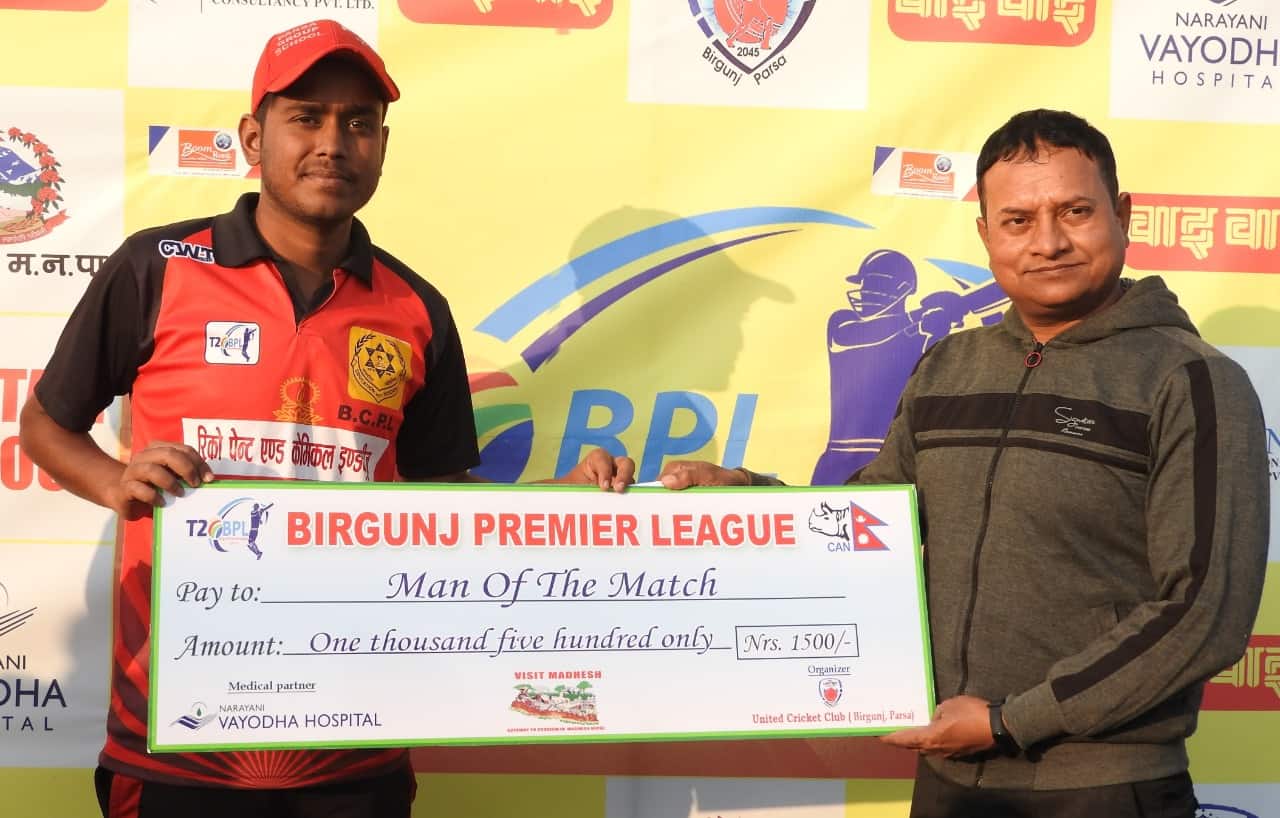 खेलको म्यान अफ द म्याच विजयी टिम वीरगन्ज स्टारका हरिशंकर साह २६ बलमा ३५ रन र ४ ओभरमा २ विकेट लिएर घोषित भएका थिए ।
