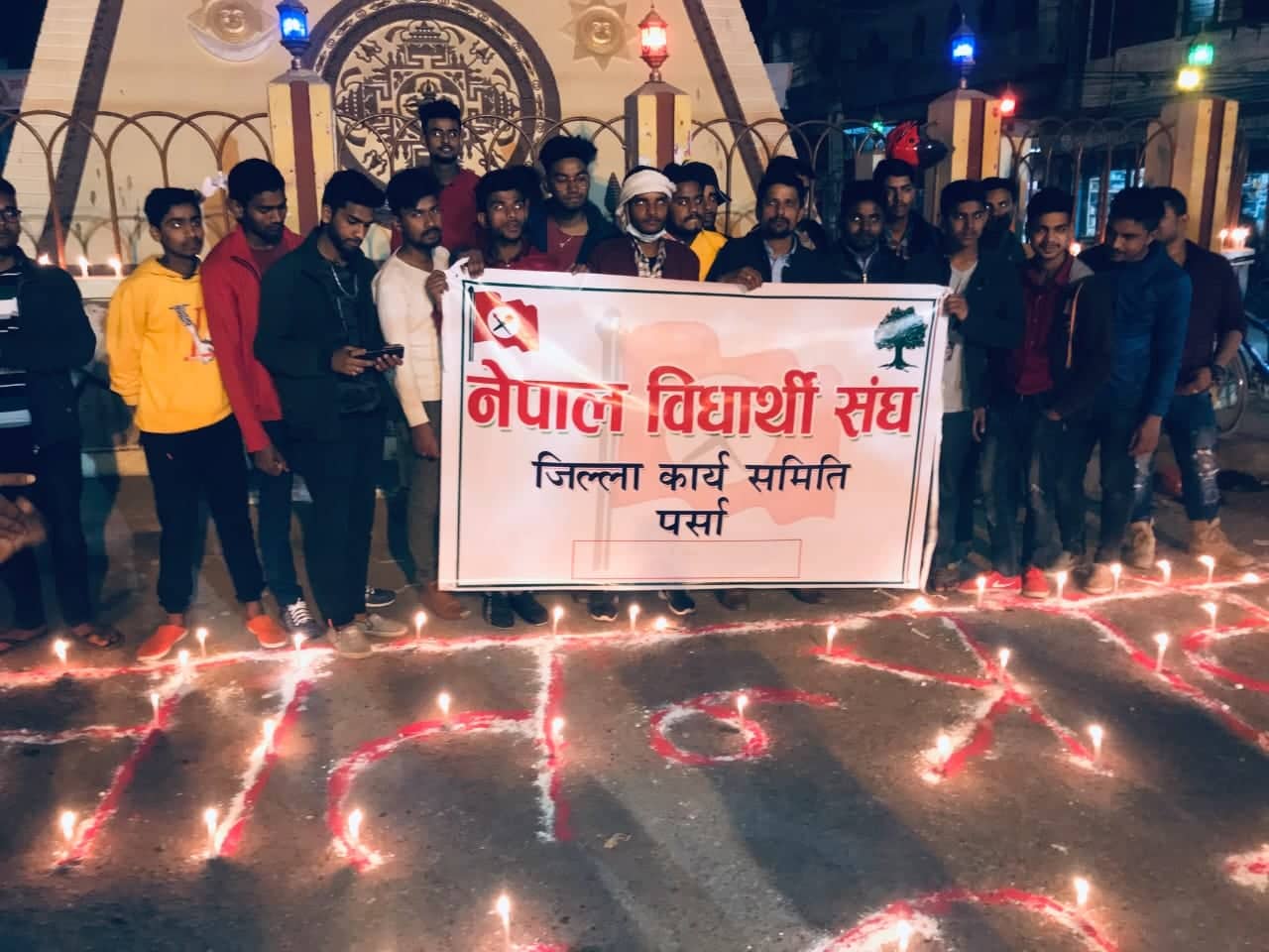 वीरगंज । ७० औं प्रजातान्त्र दिवसको अवसरमा नेपाल विद्यार्थी संघ पर्साद्वारा आज वीरगंजकाे घण्टाघरमा दिप प्रज्वलन गरिएकाे छ ।