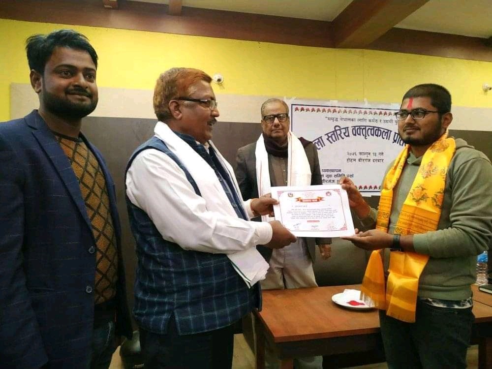 राष्ट्रिय यूवा परिषद् र वीरगंज महानगरपालिकाको संयुक्त आयोजनामा वीरगंजमा भएको प्रतियोगितामा प्रभाकर साह प्रथम भएका छन् । प्रतियोगितामा पुष्पा गुप्ता द्वितिय, गंगा श्रेष्ठ तृतिय र रेष्मा शर्मा सन्तवना पुरस्कार पाए ।