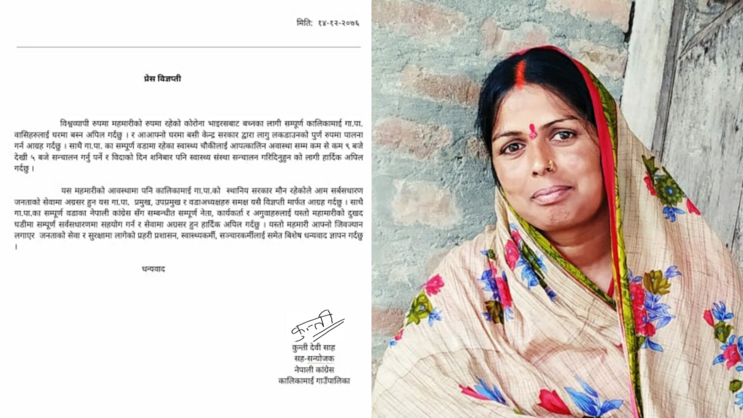 वीरगंज । विश्वव्यापी रुपमा महमारीको रुपमा रहेको कोरोना भाइरसबाट बच्नका लागी सम्पूर्ण कालिकामाई गाउँपालिका वासिहरुलाई घरमा बस्न नेपाली काङ्ग्रेस कालिकामाई गाउँपालिकाकी सह संयोजक कुन्ती देबी साहले आग्रह गर्नु भएको छ ।