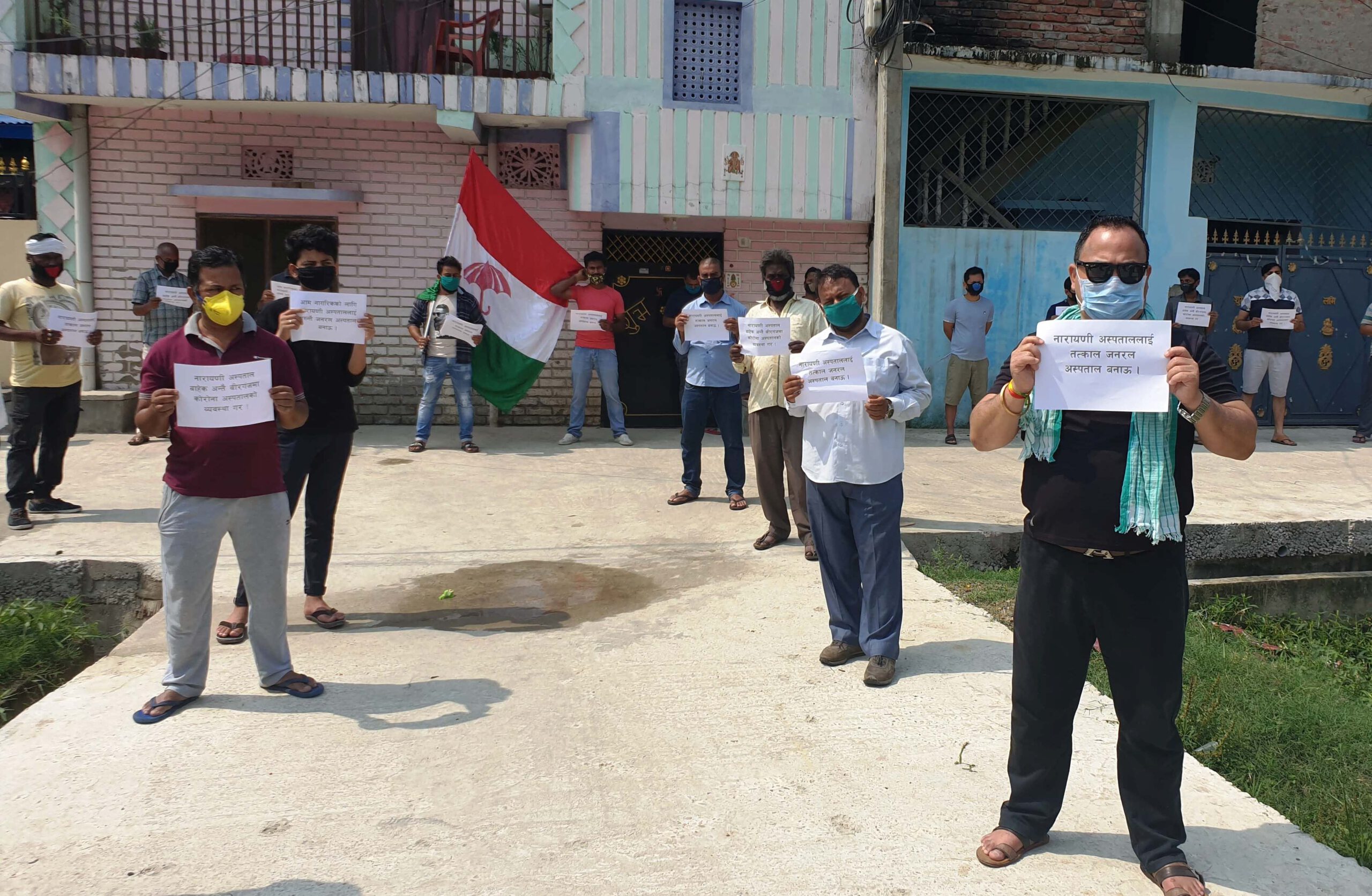 वीरगंज ३ आदर्शनगरमा भएकाे बिराेधकाे कार्यक्रममा सहभागिहरुले नारायणी अस्पताल बाहेक अन्तै वीरगंजमा काेराेना अस्पतालकाे व्यवस्था गर, आम नागरिककाे लागि नारायणी अस्पताललाई तुरुन्तै जनरल अस्पताल बनाउ, नारायणी अस्पताललाई तत्काल जेनरल अस्पताल बनाउ लगायतकाे नारा लेखिएकाे प्ले कार्ड सहित शान्तिपूर्ण प्रदर्शन गरेका थिए ।