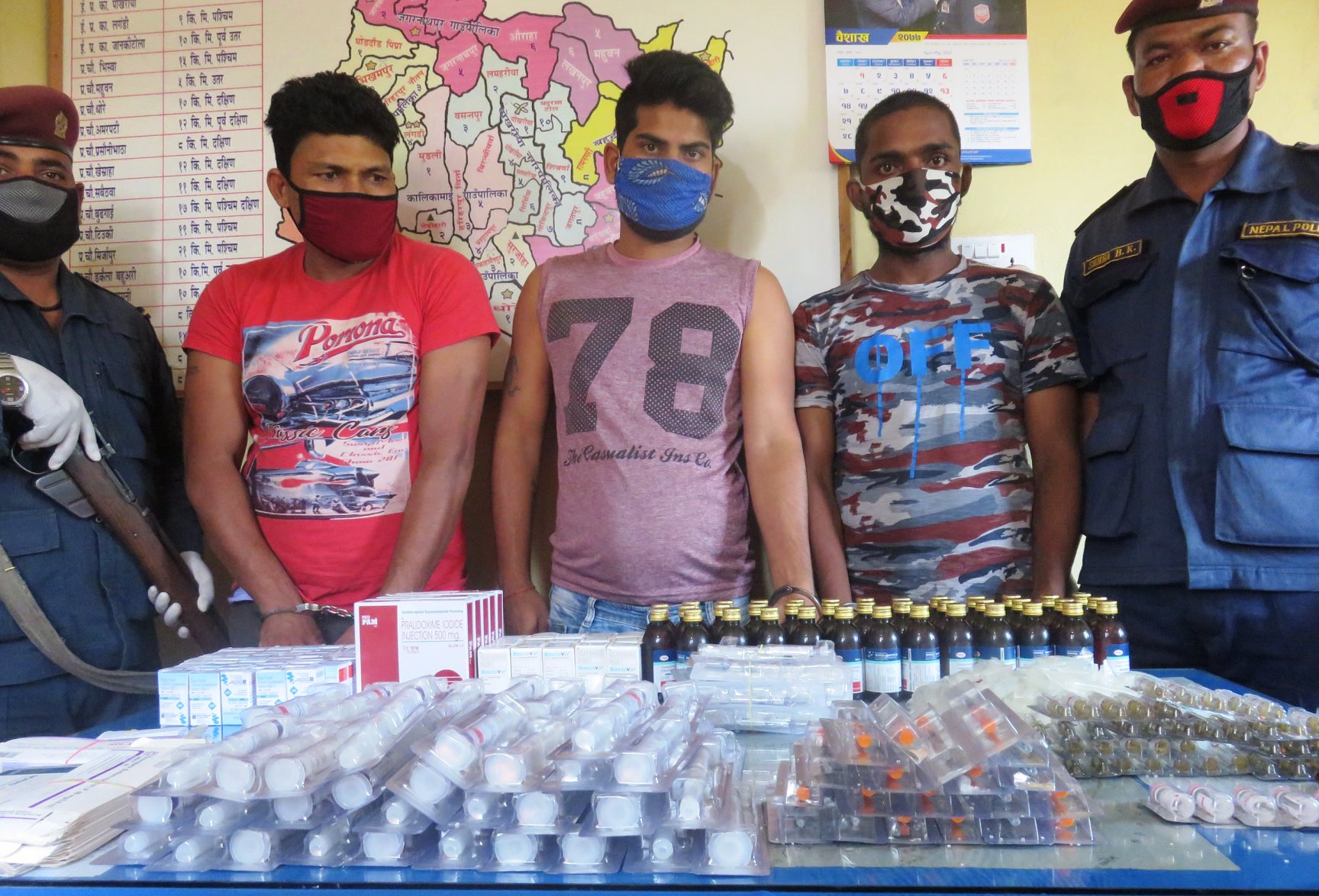 निजहरुकाे साथबाट ONEREX ( Chlorphenirarime Maleate & Codeine Phosphate Syrup) ३८ वोतल, NORAD (Sterile Noradrenaline Concentrate I.P.) लेखिएको ईन्जेक्शन ५० एम्पुल, Neoclovir (Aciclovir Intravenous Infusion I.P.) लेखिएको ईन्जेक्शन १५ थान, HUCOG-5000 HP (Highly Purified Chorionc Gonadotophin) Injection 500 I.u. ५० थान, RHOCLONE (Anit–D Rho Lmmunoglobulin Monoclonal लेखिएको ईन्जक्शन ५ थान, WEPOX* 4000 (Erythropoietin Injection IP 4000 I.U लेखिएको ईन्जक्शन १२ थान, Enoxaparin Sodium Injection (I.p/60mg/o.6ml) लेखिएको ईन्जक्शन २० थान, Cerviprime 0.5 mg (Dinoprostone Gel) लेखिएको निडिल सहितको ईन्जेक्शन ६० थान, Red Pam Injection (Pralidoxime Iodide Injection 500 mg) लेखिएको ईन्जेक्शन २५ थान बरामद भएकाे इप्रका पाेखरियाले जनाएकाे छ ।