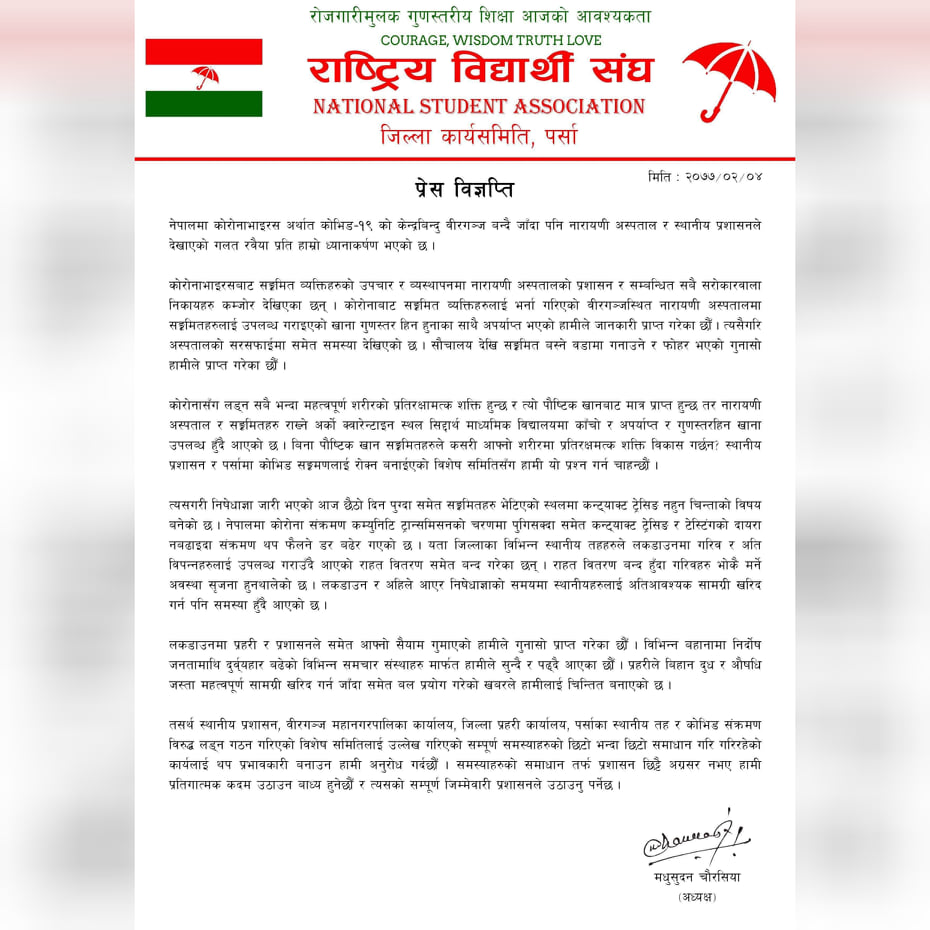 राष्ट्रिय विद्यार्थी संघ पर्साले आइतबार प्रेस विज्ञप्ति जारि गर्दै वीरगञ्जमा कोरोना सङ्क्रमण रोकथाम तथा नियन्त्रण र सङ्क्रमितहरुको उपचारमा व्यस्थापन चुकेको आरोप लगाउँदै आपत्ति जनाएका हाे । संघका जिल्ला अध्यक्ष मधुसुधन चौरसियाले प्रेस विज्ञप्ति जारी गर्दै स्थानीय प्रशासन, नारायणी अस्पताल प्रशासन र अन्य सरोकारवाला निकायहरुले कोरोना रोकथाम तथा सङ्क्रमितहरुको व्यस्थापनमा लापरवाही गरेको आरोप लगाउँदै गल्ति सच्याउन अनुरोध गरेका हुन् ।