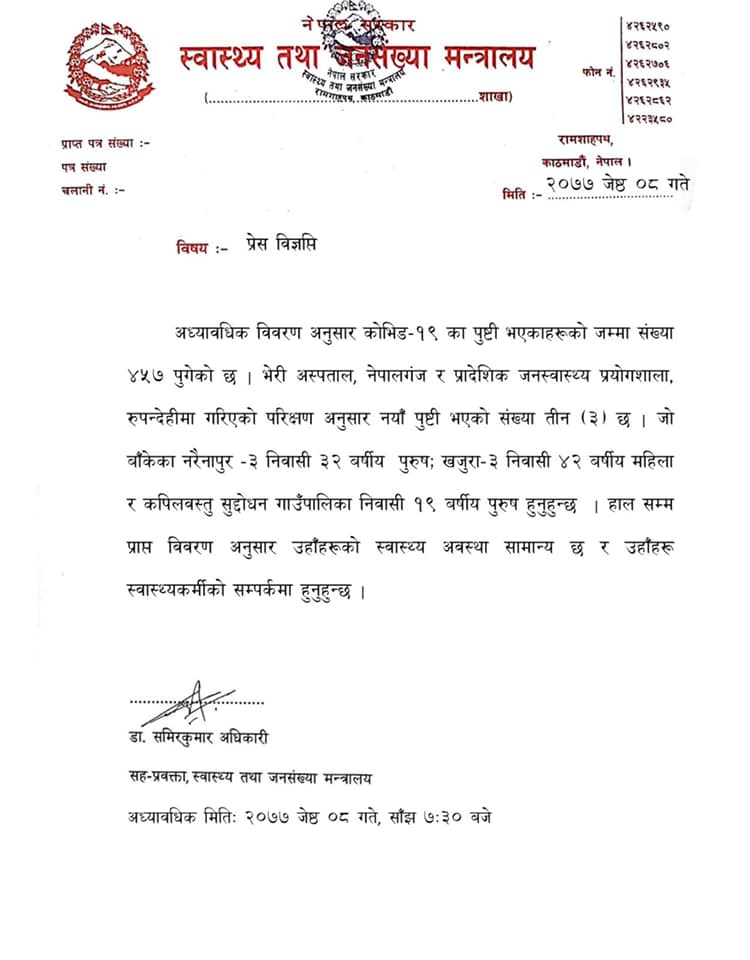 भेरी अञ्चल अस्पताल र प्रादेशिक जनस्वास्थ्य प्रयोगशाला रुपन्देहीमा गरिएको परीक्षणमा पछिल्लो पटक तीन जनामा कोरोना संंक्रमण पाइएको स्वास्थ्य तथा जनसंख्या मन्त्रालयका सह प्रवक्ता डा समिर कुमार अधिकारीले जानकारी दिए ।