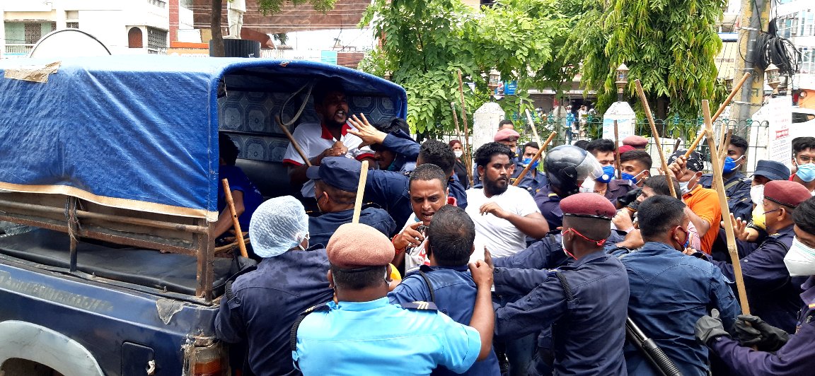 नेवि संघ पर्साले वीरगंजकाे घण्टाघरमा गरेकाे प्रदर्शनमा प्रहरीले हस्तक्षेप गर्दै ६ जना विद्यार्थी नेताहरुलाई पक्राउ गरेकाे हाे ।