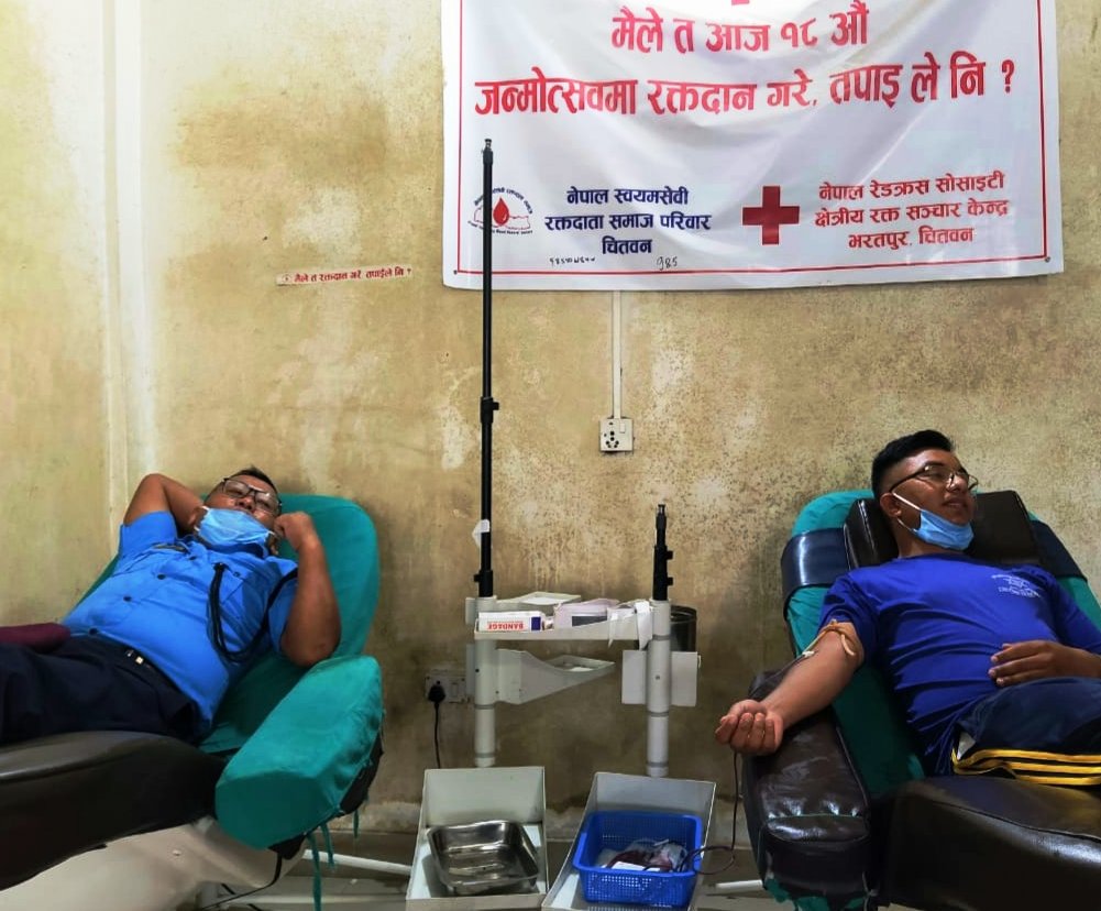 भरतपुरमा उपचारत वीरगंजका एक पुरुषकाे अप्रेसनका लागि ३ जना प्रहरीले आज रक्तदान गरेका हुन् । वीरगंजका युवा समाजसेवी राजन श्रीवास्तवकाे समन्वयमा चितवन तालिम केन्द्रमा कार्यरत प्रहरी निरीक्षक निशान थापाकाे सहयाेगमा बिरामीलाई रक्त उपलब्ध गराई सहयोग गरिएकाे हाे ।