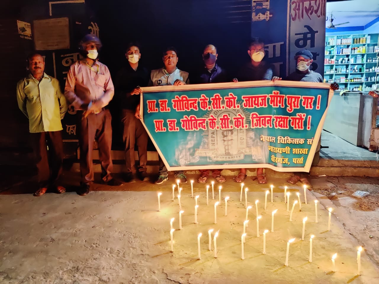 नेपाल चिकित्सक संघ नारायणी शाखा, वीरगंजकाे आयाेजनामा चिकित्सकहरुले डा. गाेबिन्द केसीकाे जायज माँग पुरा गर, डा. गाेबिन्द केसीकाे जिवन रक्षा गराैं लेखिएकाे ब्यानरसहित दिप प्रज्वलन गरेका हुन् ।