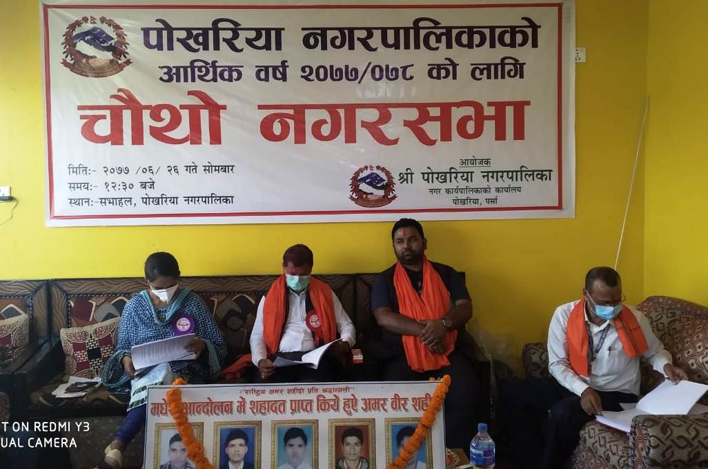 वीरगंज । पर्साकाे पोखरिया नगरपालिकाको चौथो नगर सभा साेमबार सम्पन्न भएको छ । नगर सभामा चालु आर्थिक बर्ष २०७७/०७८ काे लागि रु ५० करोड ७५ लाख ३५ हजार ३ सय ३७ बराबरकाे नीति तथा कार्यक्रममा प्रस्तुत गरिएकोमा ७ करोड घाटा बजेट सच्याएर प्रसतुत गरिएको थियो ।