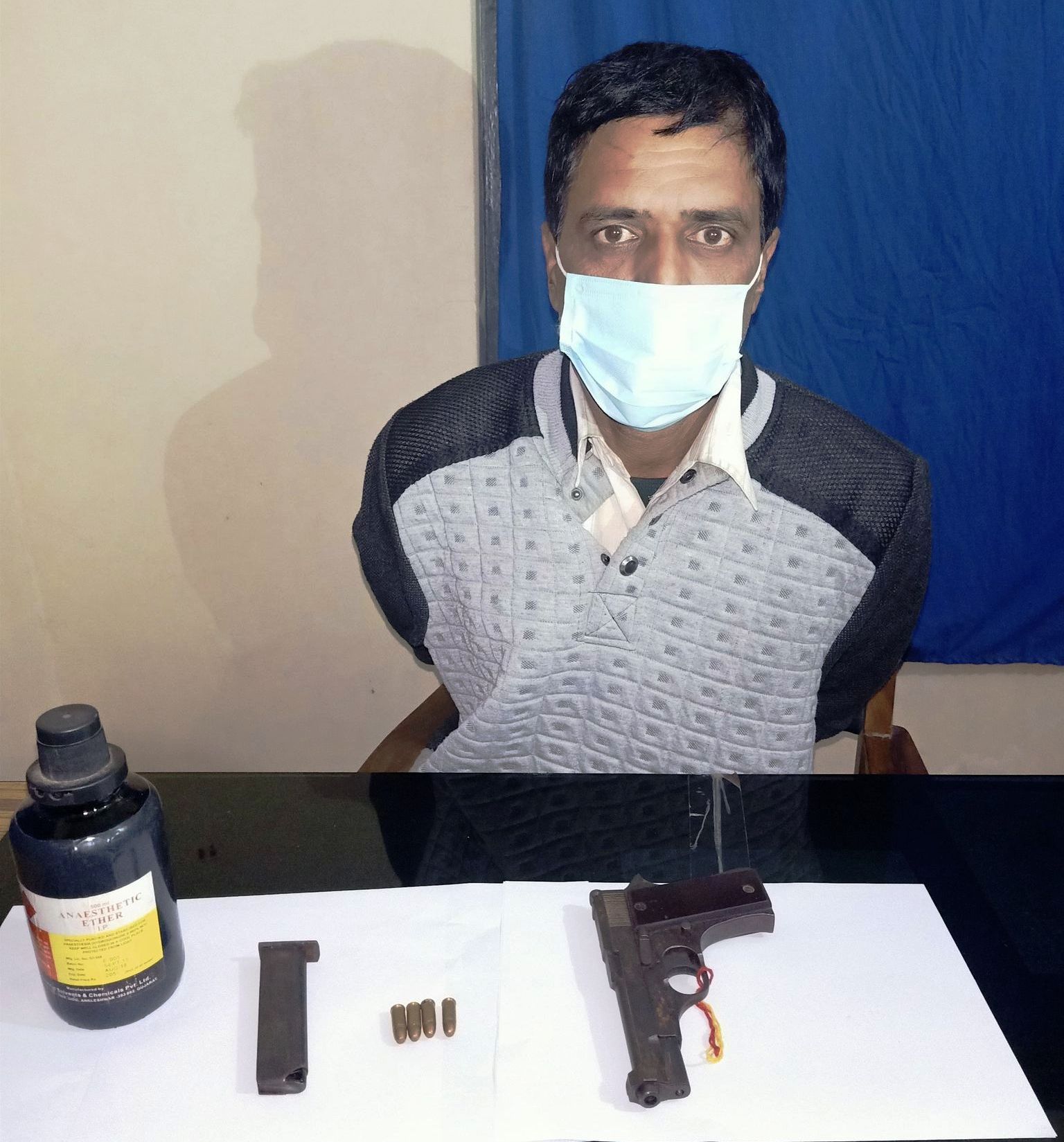 प्रहरीका अनुसार निजकाे घरबाट म्यागजिन थान-१,पेस्तौल थान-१ र मानिसलाई बेहोस पार्ने Anaesthetic Ether I.P. 500 ml को १ बोत्तल बरामद भएकाे हाे ।