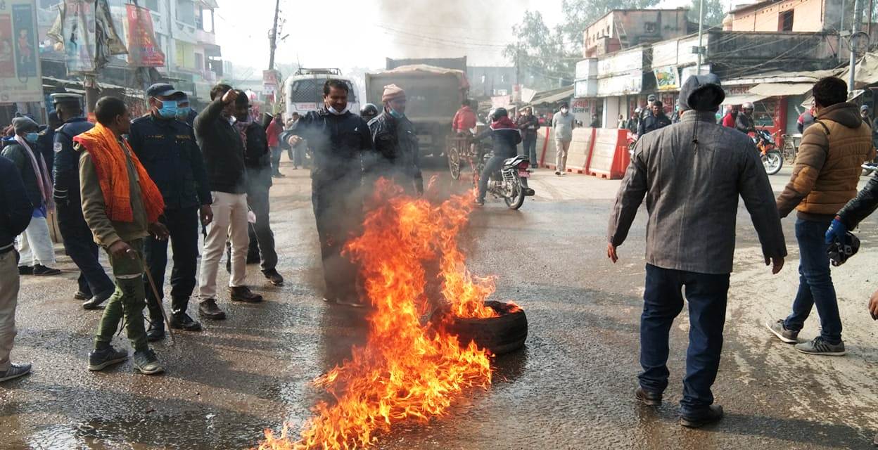 नेकपा जिल्ला कमिटी सदस्य ध्रुव यादवसहितका नेता तथा कार्यकर्ताहरुले टायर बालेर प्रदर्शन गरेका थिए । प्रदर्शनका क्रममा प्रदर्शनकारीहरु चक्राे नाराबाजीसमेत गरेका थिए ।