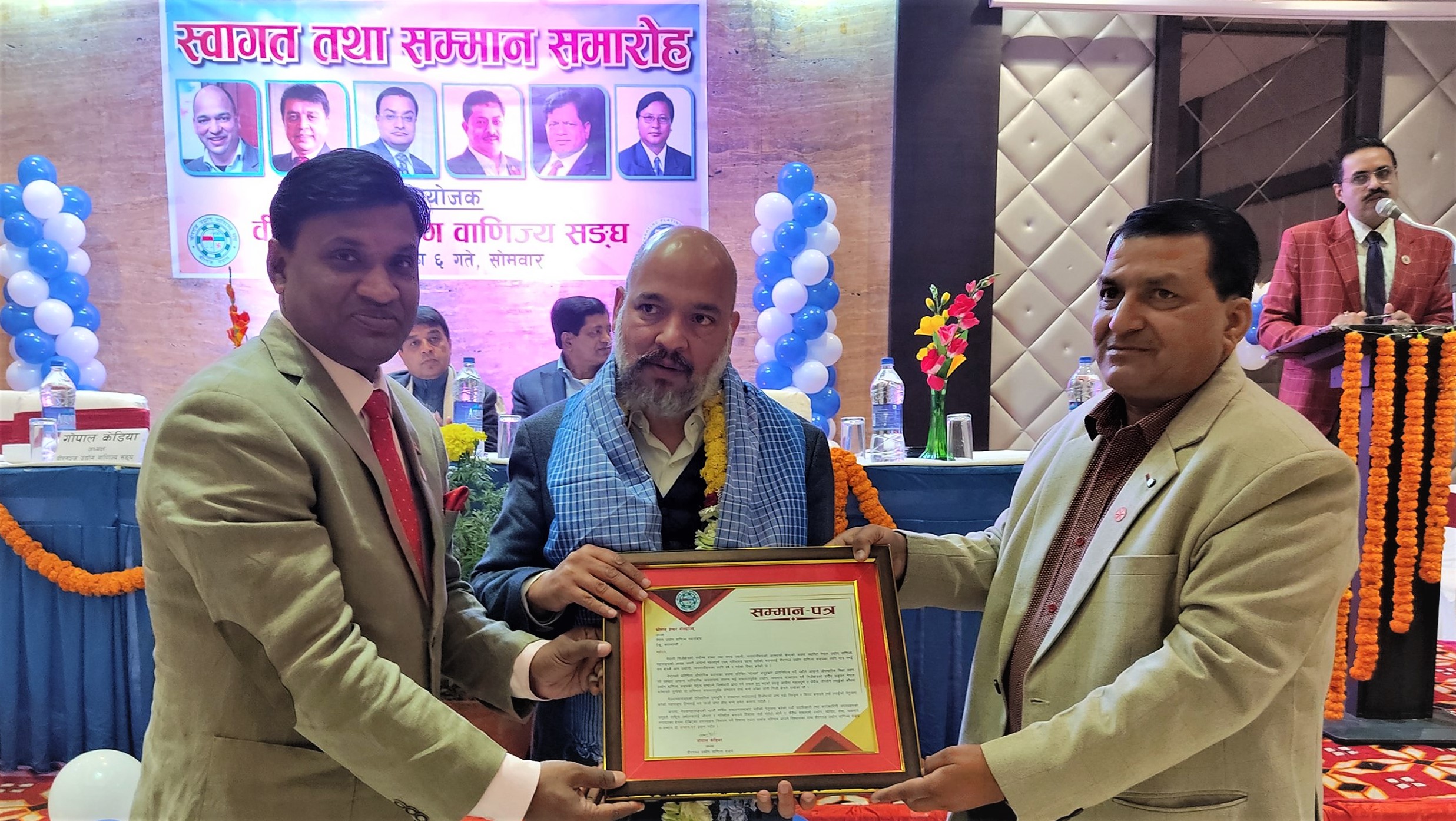 वीरगंज । नेपाल उद्योग बाणिज्य संघका नवनिर्वाचित पदाधिकारी आज एक कार्यक्रमका बिच सम्मानित भएका छन् ।