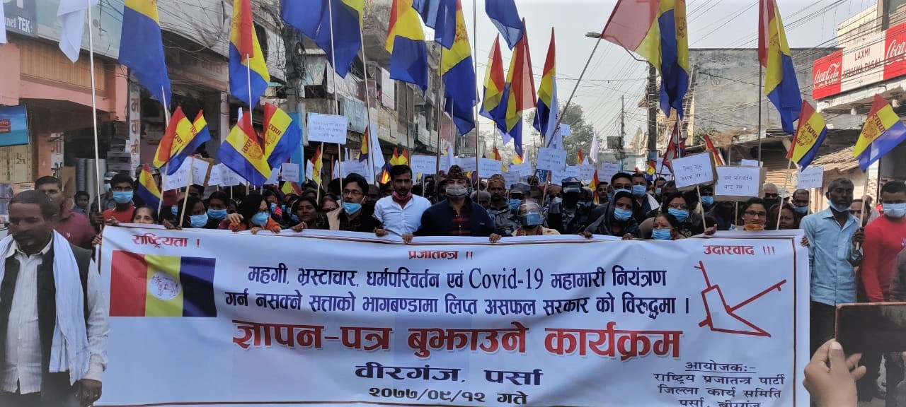 वीरगंज । राष्ट्रिय प्रजातन्त्र पार्टी पर्साले पनि आईतबार वीरगंजमा बिरोध जुलुस निकालेको छ ।