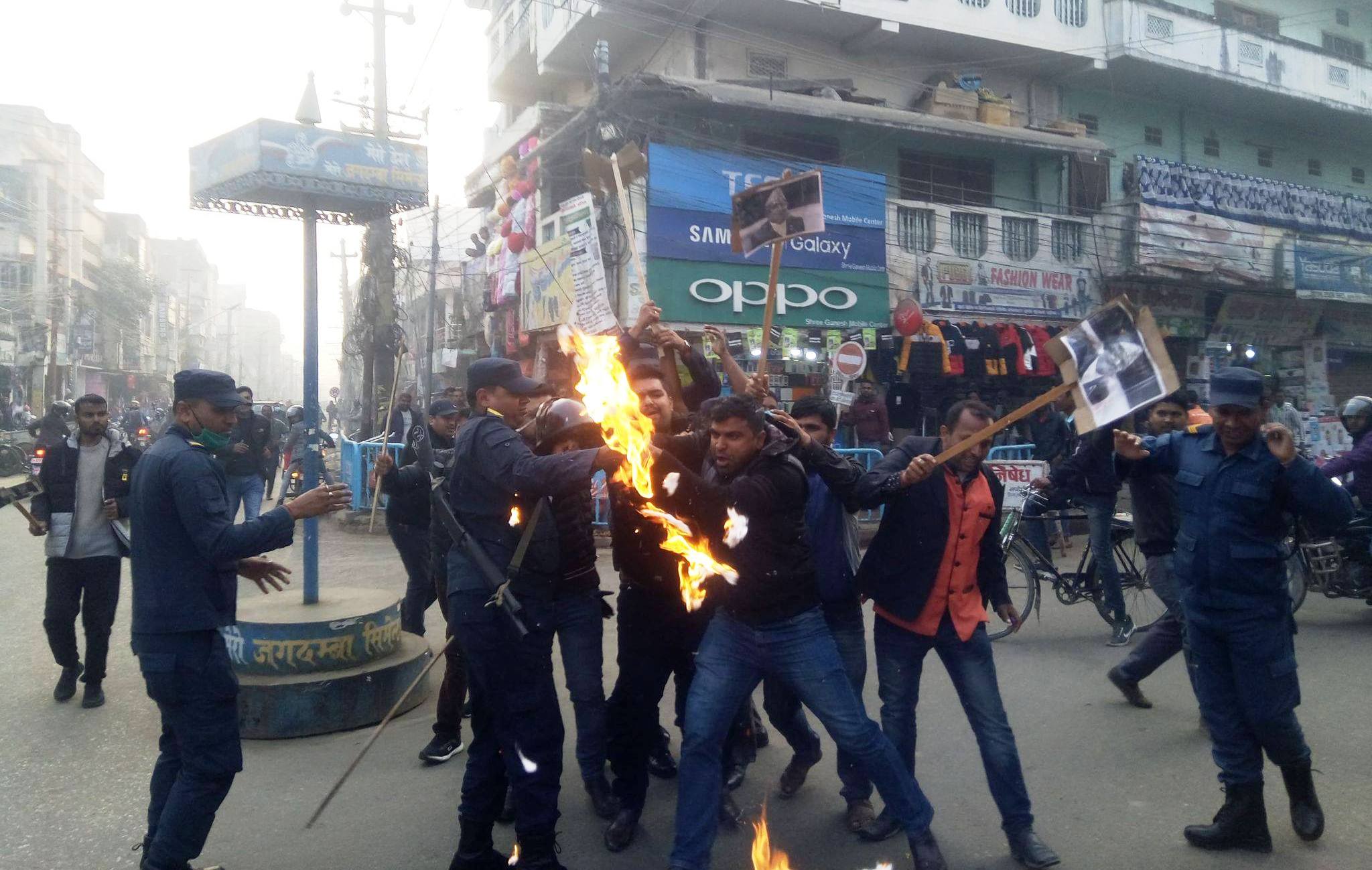 विरोध सभामा सहभागीहरुले ‘केपी ओली मुर्दावाद, संसद विघटन गर्न पाइँदैन, संविधान विरोधी निर्णय खारेज गर’ लगायतका नारा लगाएका थिए । पुतला दहन गर्ने क्रममा प्रहरीले हस्तक्षेप समेत गरेको थियो ।