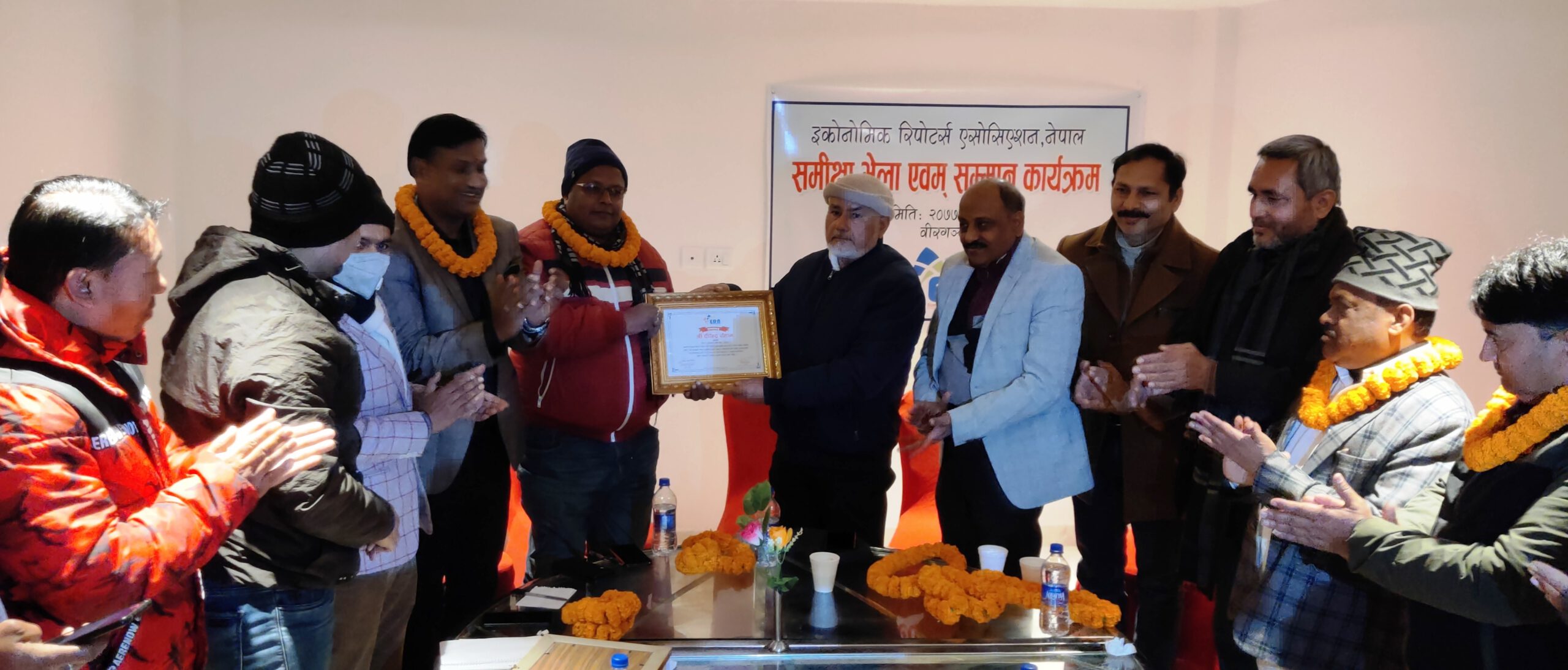 वीरगंज । इकाेनाेमिक रिपाेटर्स एसाेसिएशन नेपालले आज एक कार्यक्रमका बिच दुई पत्रकारसहित ४ जनालाई सम्मान गरेकाे छ ।