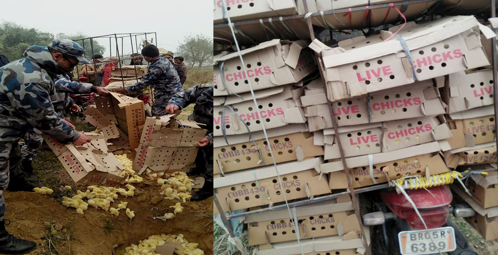 पर्साको विन्दासिनीदेखी उत्तरतर्फ द्यच्ण्छ च्् टघडढ नम्बरको भारतीय मोटरसाईकलमा लगिरहेको अवस्थामा पक्राउ गरिएको उक्त कुखुराको चल्ला शनिबार दिउसो बहुअर्वाभाठ्ठा बेस क्याम्प पछाडी खाल्डो खनि नष्ट गरिएको प्रहरीले जनाएको छ । प्रहरीका अनुसार पक्राउ गरिएको कुखुरासहितको गाडीको अन्दाजी मूाल्य रु १ लाख ५८ हजार रहेको छ । शनिबार विदा भएकोले मोटरसाईकललाई भोली वीरगंज भन्सार कार्यलयमा बुझाउने सशस्त्र प्रहरीले जनाएको छ ।