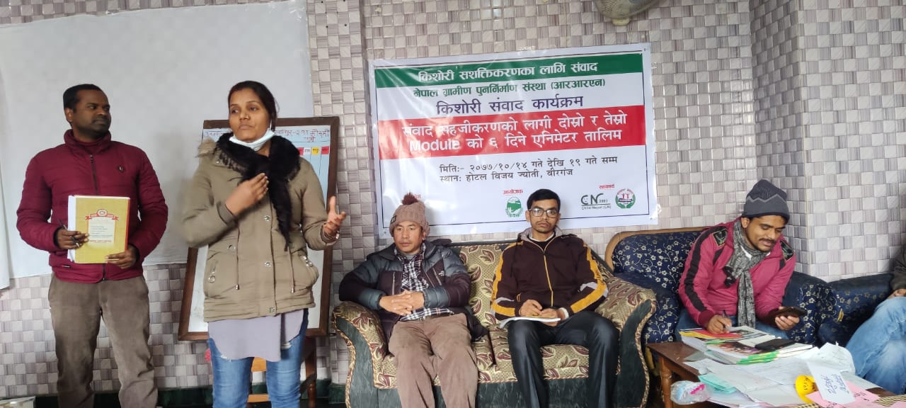 युराेपिएन युनियनकाे सहयाेग र चाइल्ड नेपाल, संरक्षण नेपालकाे सहकार्य तथा ग्रामिण पुनर्निमाण संस्था (आरआरएन) काे आयाेजनामा संचालित किशाेरी संवाद कार्यक्रम अन्तर्गत हाेटल विजय ज्याेति वीरगंजमा संचालित तालिम सम्पन्न भएकाे हाे ।