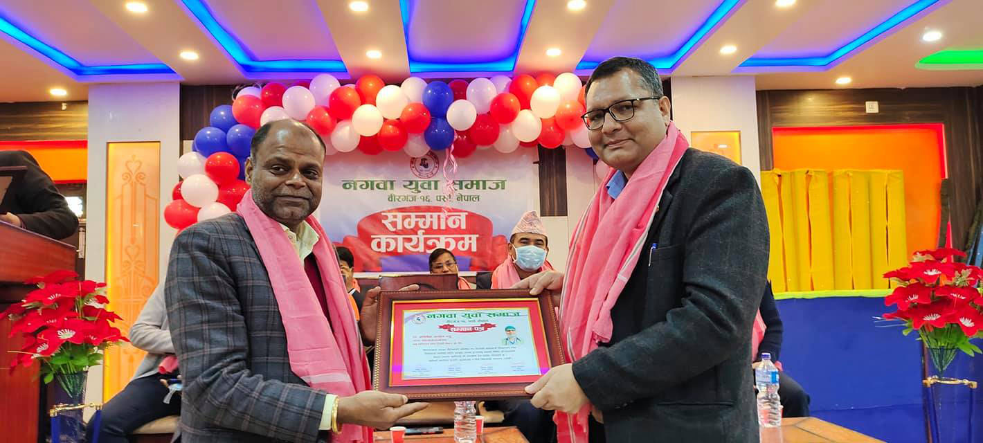 वीरगंज । कोरोना भाइरसको महामारीमा अग्रपंक्तिमा खटिएका ३५ जनालाई नगवा युवा समाजले सम्मान गरेको छ । समाजका अध्यक्ष अजय पासवानको सभापतित्वमा भएको कार्यक्रममा चिकित्सक, नर्स, सफाईकर्मीलगायतका ३५ जनालाई सम्मानपत्रले सम्मान गरिएको थियोे ।