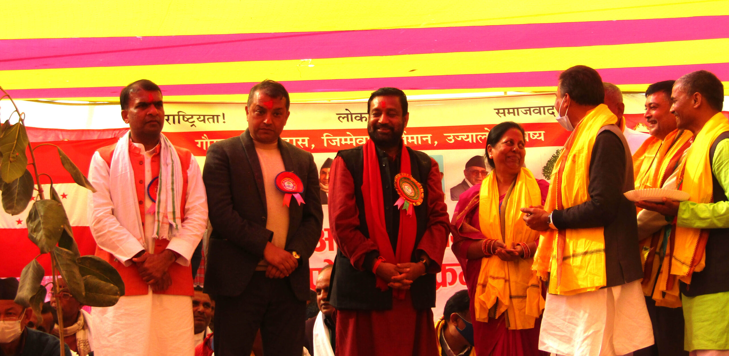 नव प्रवेशीहरुलाई गम्छा ओढाएर कार्यक्रमका प्रमुख अतिथि, विशिष्ट अतिथि र अतिथिहरुले पार्टीमा स्वागत गरेका थिए ।