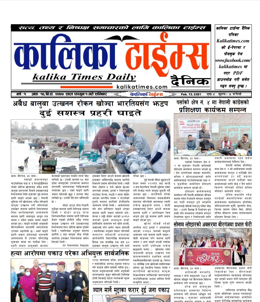 २०७७ फागुन १ गते शनिबारको कालिका टाईम्स दैनिक न्युज डेस्क फाल्गुन १, २०७७ [real3dflipbook id=”16″] ताजा अपडेट पर्सामा अवैध साल काठसहित ट्याक्टर बरामद, एक जना नियन्त्रणमा महुवनमा गुठीको अतिक्रमित जग्गाबाट ३८० घरटहरा हटाइयो, ७ डोजर प्रयोग परवानीपुर गोल्डकप फुटबल प्रतियोगिताको उपाधि निजगढ फुटबल क्लबलाई वीरगंज–१० मा ३९ जनाद्वारा रक्तदान, वडाबासीलाई निःशुल्क रगत उपलब्ध गराउने सहमति पर्सामा ढिलाइपछि कांग्रेसको ‘जरा अभियान’ सुरु, संगठन सुदृढीकरणमा जोड न्युज डेस्क थप समाचार पर्सामा अवैध साल काठसहित ट्याक्टर बरामद, एक जना नियन्त्रणमा वीरगंज । पर्सामा अवैध रूपमा ओसारपसार हुँदै गरेको साल काठसहित एक ट्याक्टर नियन्त्रणमा लिइएको छ । सबैया सब डिभिजन वन कार्यालयको टोलीले उक्त कारबाही... महुवनमा गुठीको अतिक्रमित जग्गाबाट ३८० घरटहरा हटाइयो, ७ डोजर प्रयोग वीरगंज । पर्साको सखुवा प्रसौनी गाउँपालिका–५ महुवनस्थित पारसनाथ मन्दिरको करिब ६ विघा अतिक्रमित जग्गा आइतबार बिहान खाली गराइएको छ । अतिक्रमण हटाउन ७ वटा... परवानीपुर गोल्डकप फुटबल प्रतियोगिताको उपाधि निजगढ फुटबल क्लबलाई वीरगंज । पाँचौं परवानीपुर गोल्डकप फुटबल प्रतियोगिता को उपाधि निजगढ फुटबल क्लब ले उचालेको छ । शनिबार भएको फाइनल खेलमा निजगढ फुटबल क्लबले आयोजक...