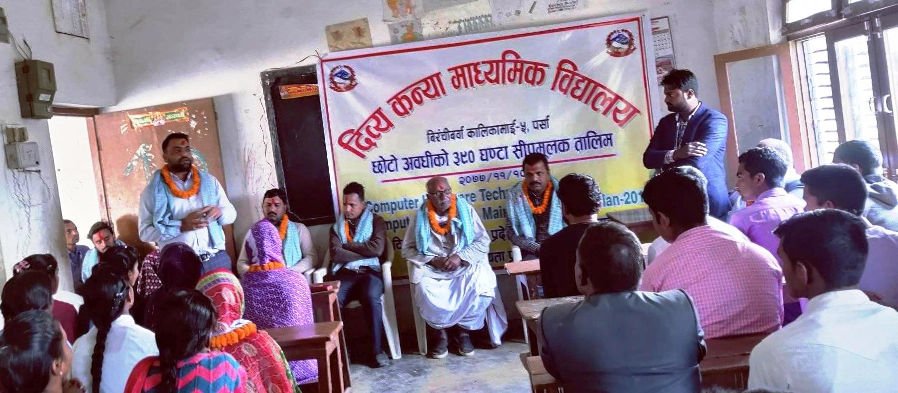 वीरगंज । पर्साकाे कालिकामाई गाउँपालिका वडा नं. ५ बिरन्चीबर्वास्थित रहेकाे दिव्य कन्या माध्यमिक विद्यालयमा साेमबारदेखी छाेटाे अवधिकाे ३९० घण्टा सीपमूलक तालिम अन्तर्गत कम्प्युटर तालिम सुरु भएकाे छ ।