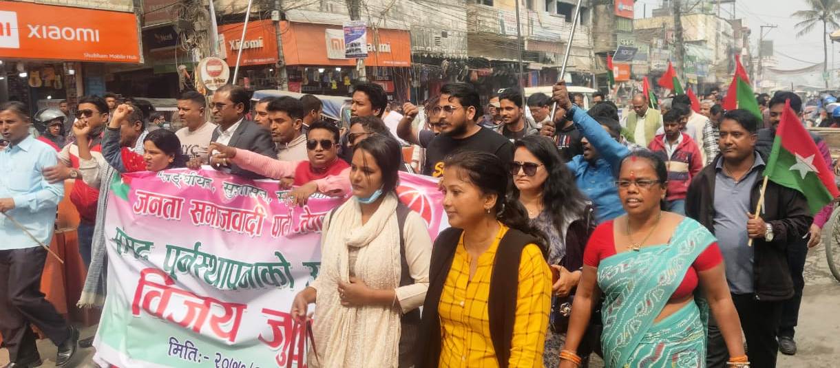 वीरगञ्ज । प्रतिनिधि सभा विघटनको निर्णय सर्वाेच्च अदालतले खारेज गरेपछि बुधबार जनता समाजवादी पार्टी (जसपा) पर्साले विजयी जुलुश निकालेको छ ।