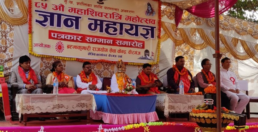 जितपुर । ब्रह्म कुमारी राजयोग सेवा केन्द्र वीरगंजले शुक्रबार ८५ औँ महाशिवरात्रि महोत्सव ज्ञान महायज्ञको अवसरमा पत्रकारहरुलाई सम्मान गरेको छ । बाराको पिलुवामा आयोजित महोत्सव उद्घाटन कार्यक्रममा पर्सा, बारा र रौतहटका ५ दर्जन पत्रकारहरुलाई सेवा केन्द्रले सम्मान गरिएको थियो ।