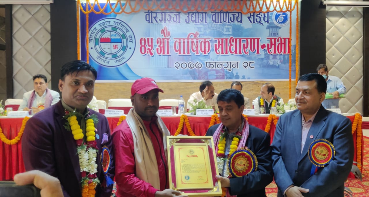 वीरगंज । वीरगंज उद्याेग वाणिज्य संघले आफ्नाे ४५ औं वार्षिक साधारण सभाकाे अवसरमा ३ जना पत्रकारलाई प्रशंसा पत्रले सम्मान गरेकाे छ ।