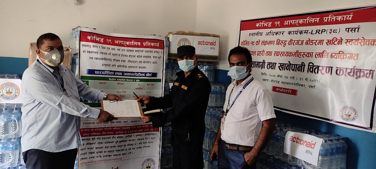 एक्शनएड नेपाल तथा दिब्य युवा क्लब पर्साको संयूक्त साझेदारीमा संचालित स्थानीय अधिकार कार्यक्रम अन्तर्गत सर्जिकल माक्स २५०० थान, सेनिटाइजर २५ लिटर तथा खानेपानीको लागि मिनिरल वाटर २०४० बोतल इनार्वा प्रहरी चाैकीलाई हस्तारन्तण गरिएकाे हाे ।