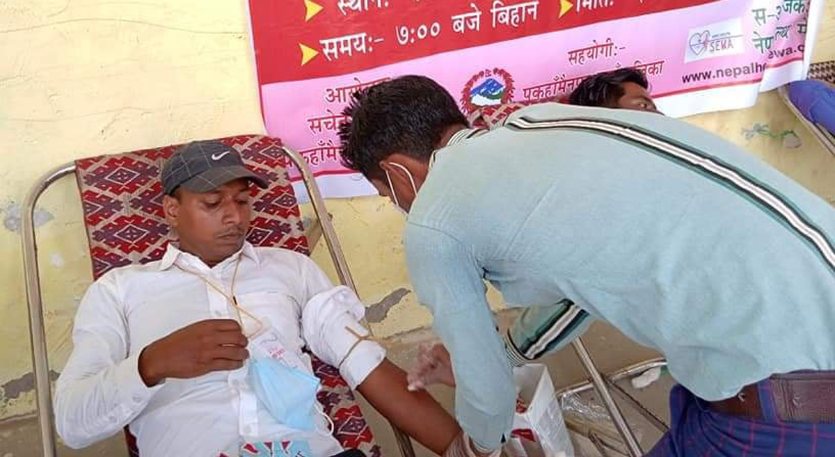 वीरगंज । सचेत युवा समाज पकाहा मैनपुरको आयोजनामा शनिबार पकहा मैनपुर गाउँपालिकामा रक्तदान कार्यक्रम सम्पन्न भएको छ । श्रीराम चरित्र भगत मा.वि. पकहा मैनपुरमा भएको कार्यक्रममा ४ महिलासहित एक सय जनाले रक्तदान गरेको रक्तसञ्चार केन्द्र वीरगंजका प्रमुख सौरभ राज पाण्डेले बताए ।