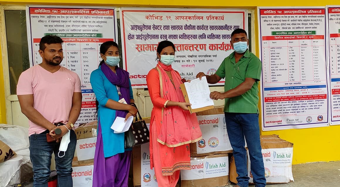 एक्शनएड नेपाल, आईरिशएड तथा दिब्य युवा क्लब, पर्साकाे संयुक्त साझेदारीमा संचालित महिला अधिकार समुन्नति परियाेजना अन्तर्गत पाेखिरया नगरपालिकाकाे वडा न. ७, ८, १०, पकाहा मैनपुर गाउँपालिकाकाे वडा न. ३ र बिन्दाबासिनी गाउँपालिकाकाे वडा न. ५ मा स्वास्थ्य सुरक्षा सामग्री वितरण गरिएकाे हाे ।