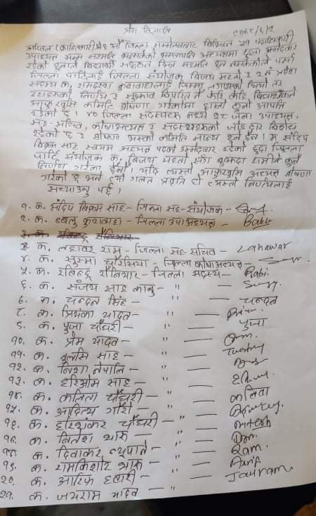 समिति चयनको केही समय नवित्दै जिल्लाा अध्यक्षका दाबेदार रहेको संंदिप बिक्रम साह लगायत २७ जना जिल्ला सदस्यले विमती जनाएका छन् ।