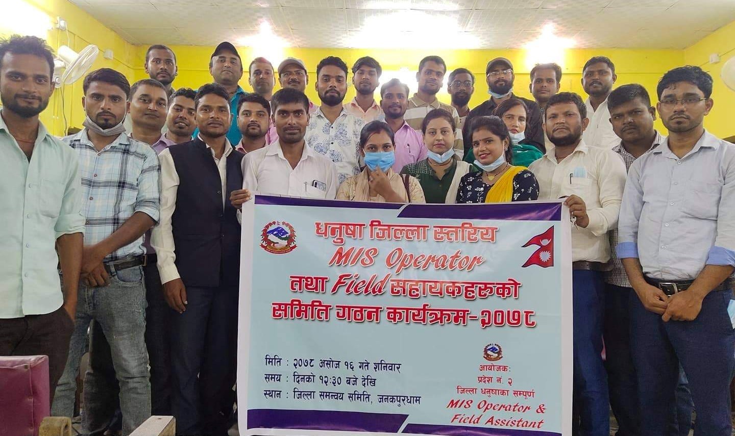 वीरगंज । धनुषामा पनि एमआईएस अपरेटर र फिल्ड सहायकहरुको समिति गठन भएकाे छ । जिल्ला समन्वय समितिको सभा हलमा भएको एमआइएस अपरेटर र फिल्ड सहायकहरुकाे भेलाले शुशिल कुमार यादवको अध्यक्षतामा १३ सदस्यीय जिल्ला समिति गठन गरेको हाे ।