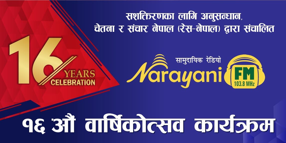 सशक्तिकरणका लागि अनुसन्धान, चेतना र संचार नेपाल (रेस नेपाल)द्वारा संचालित सामुदायिक रेडियो नारायणी एफएम १०३.८ मेगाहर्ज स्थापना भएको १५ वर्ष पुरा भएर १६ औं वर्ष प्रवेश गरेको उपलक्ष्यमा रेडियोले विभिन्न कार्यक्रमको आयोजना गर्दैछ ।