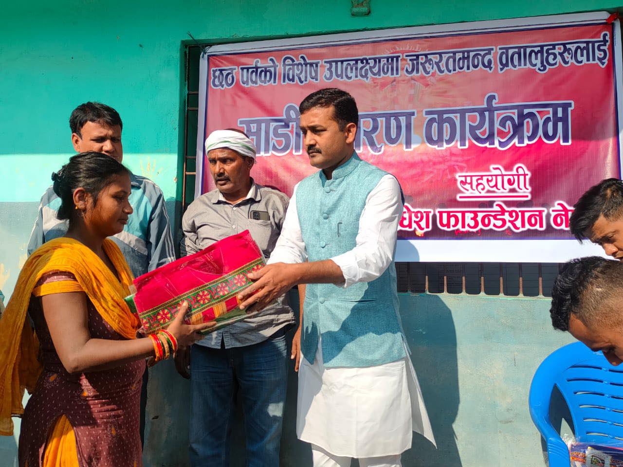 हिन्दु धर्म संस्कृतिमा छठपर्वका बेला ब्रतालुले सम्भव भए नयाँ चोखो पहिरण लगाएर ब्रत गर्नुपर्ने हो । सोही अभिलाशालाई पुर्ण गर्न हरेक वर्ष झै यसवर्षपनि मधेस फ़ाउन्डेशन नेपालको सहयोगमा आवश्यक्ता हेरेर दिन दुःखीलाई छठपुजाका लागी साडी तथा पिठो वितरण गरेको सांसद यादवले जानकारी दिए ।