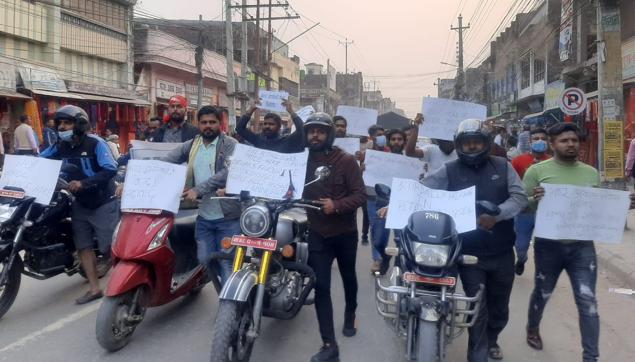 वीरगंजकाे माइस्थान चाैकमा जम्मा भएका अनेरास्ववियूका नेताहरुले त्यहाँबाट माेटरसाइकल ठेलेर घण्टाघर चाैकमा पुगेका थिए । विराेध प्रदर्शनमा सहभागिहरुले भ्रष्ट आयल निगम मुर्दाबाद, पेट्राैलियम पदार्थकाे मूल्य बृद्धि खारेज गर लगायतका नाराहरु लगाएका थिए ।
