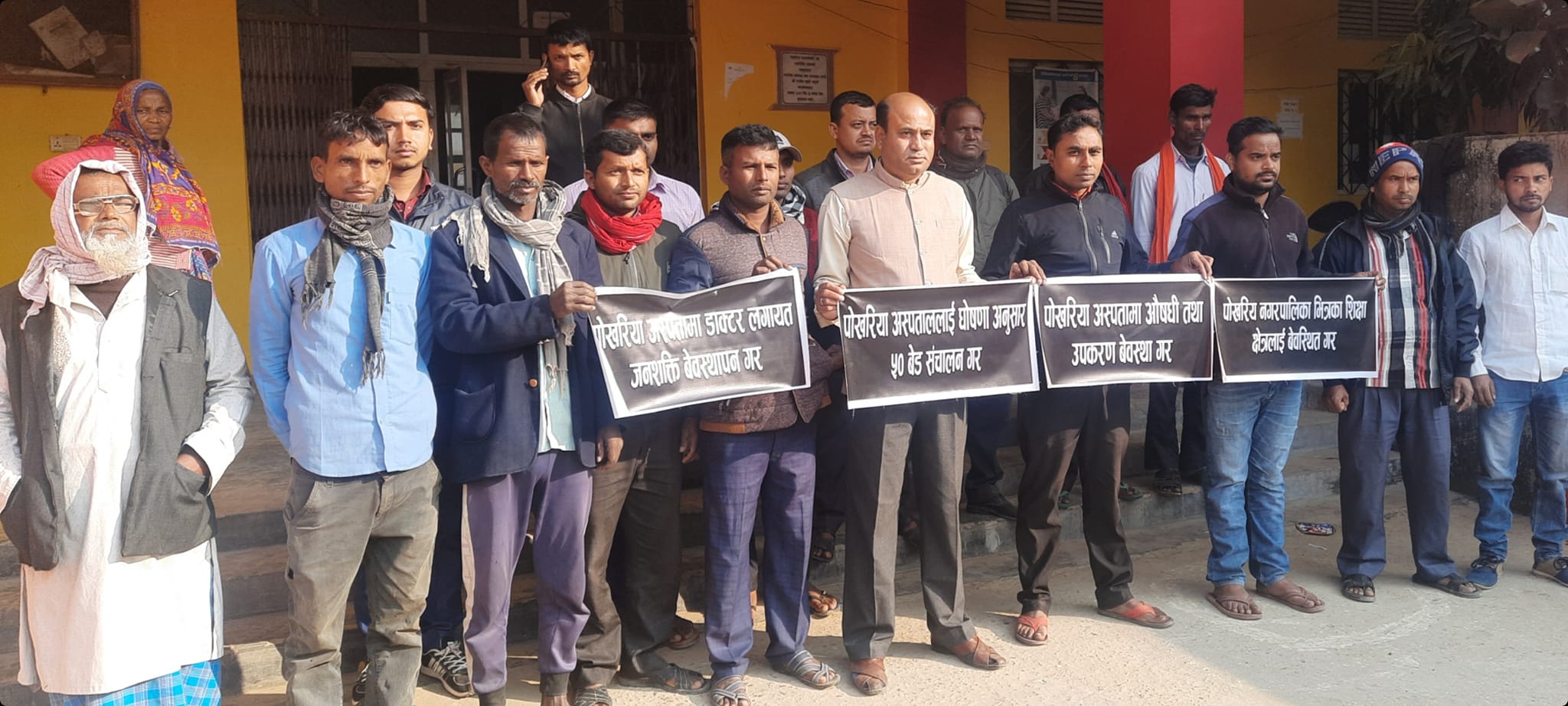 प्रदर्शनमा सहभागिहरुले पाेखरिया अस्पतालमा डाक्टर लगायत जनशक्ति व्यवस्थापन गर, पाेखरिया अस्पताललाई घाेषणा अनुसार ५० बेडकाे संचालन गर, पाेखरिया अस्पतालमा औषधी तथा उपकरण व्यवस्था गर, पाेखरिया नगरपालिका भित्रका शिक्षा क्षेत्रलाई ब्यवस्थित गर लगायतका नारा लेखिएकाे ब्यानरसहित सहभागि भएका थिए ।