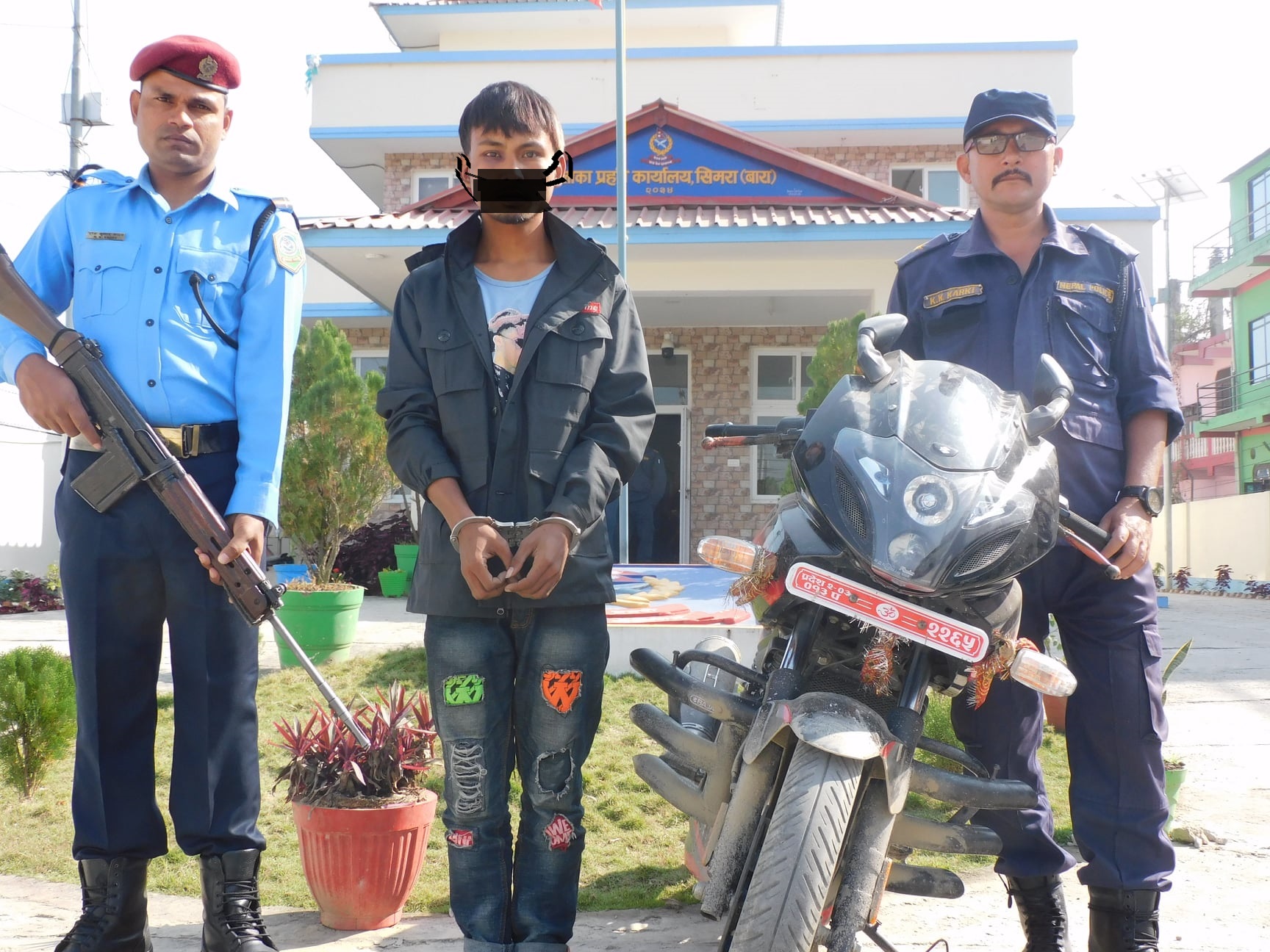 जिल्ला बारा कोहल्वी नगरपालिका वडा न.०६ बस्ने जनार्धन चौधरीको छोरा बर्ष २० को श्यामबाबु चौधरीलाई पक्राउ गरीएको र सोही स्थानमा चोरी गर्न आउदा प्रयोग गरेको ना.२३ प.८४४६ न.को मोटरसाईकल समेत फेलापरेकोले बरामद गरीएको प्रहरीले जनाएको छ।