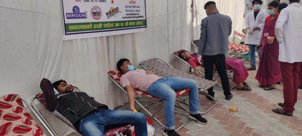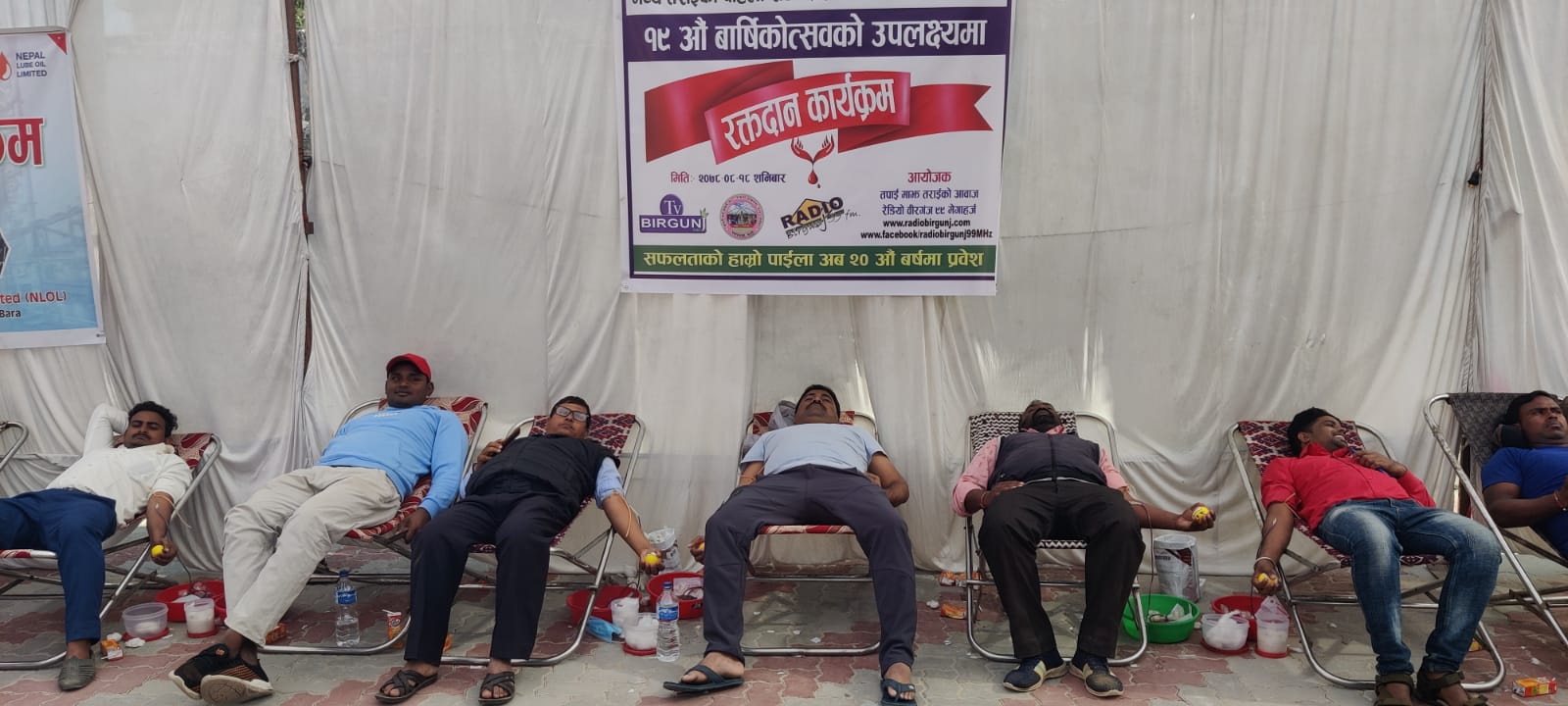 वीरगंज । मध्ये तराईकाे पहिलाे रेडियाे, रेडियाे वीरगंज ९९ मेघाहर्जले शनिबार आफ्नाे १९ औं बार्षिकाेत्सवकाे अवसरमा आयाेजना गरेका रक्तदान कार्यक्रम सम्पन्न भएकाे छ । रेडियाेका कार्यकारी अध्यक्ष ध्रुव साहकाे अध्यक्षतामा रेडियाे परिसर मै भएकाे कार्यक्रममा २५ महिलासहित ३४१ जनाले रक्दान गरेका हुन् ।