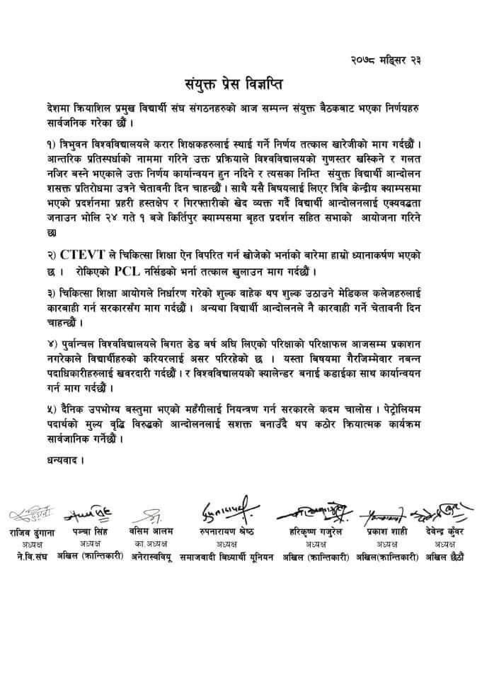‘सिटीभिटीले चिकित्सा शिक्षा ऐन विपरित गर्न खोजेको भर्नाको बारेमा हाम्रो ध्यानाकर्षण भएको छ। रोकिएको पिसिएल नर्सिङको भर्ना तत्काल खुलाउन माग गर्दछौं। चिकित्सा शिक्षा आयोगले निर्धारण गरेको शुल्कबाहेक थप शुल्क उठाउने मेडिकल कलेजलाई कारबाही गर्न सरकारसँग माग गर्दछौं। अन्यथा विद्यार्थी आन्दोलनले नै कारवाही गर्ने चेतावनी दिन चाहन्छौं,’ विद्यार्थी संगठनद्वारा जारी विज्ञप्तिमा भनिएको छ, ‘पूर्वाञ्चल विश्वविद्यालयले विगत डेढ वर्षअघि लिएको परीक्षाको परीक्षाफल आजसम्म प्रकाशन नगरेकाले विद्यार्थीहरुको करियरलाई असर परिरहेको छ । यस्ता विषयमा गैरजिम्मेवार नबन्न पदाधिकारीलाई खवरदारी गर्दछौं। र विश्वविद्यालयको क्यालेन्डर बनाई कडाईका साथ कार्यान्वयन गर्न माग गर्छौं।.