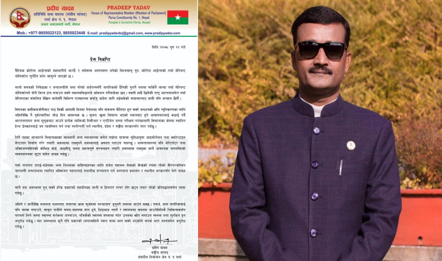 पर्साको क्षेत्र नम्बर १ बाट निर्वाचित प्रतिनिधि सभा सदस्य (सांसद) यादवले बिहिबार एउटा प्रेस विज्ञप्ति जारी गर्दै वैश्विक कोरोना भाईरसको नयाँ भेरिएन्ट ओमिक्रोनले थपेको चुनौतीबाट जोगिन पूर्व तयारी गर्न तिनै तहका सरकारसँग आग्रह गरेका हुन् ।
