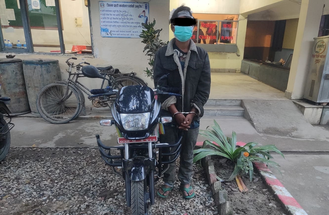 यस्तै, मोटरसाइकल चोरी गर्दागर्दै अवस्थामा एक जनालाई बुधबार पनि प्रहरीले पक्राउ गरेकाे थियाे । बिआर २२ बि ०३८७ भारतीय नम्बरको कालो रंगको हिरो होण्डा स्पेलेण्डर प्लस मोटरसाइकल चक्कुले लक भाँची चोरी गरी भाग्दै गरेकाे माेटरसाइकल चोरीमा संलग्न वीरगञ्ज महानगरपालिका वडा नं.१४ बस्ने बर्ष २३ को आशिष यादवलाई प्रहरीले नियन्त्रणमा लिएकाे हाे ।