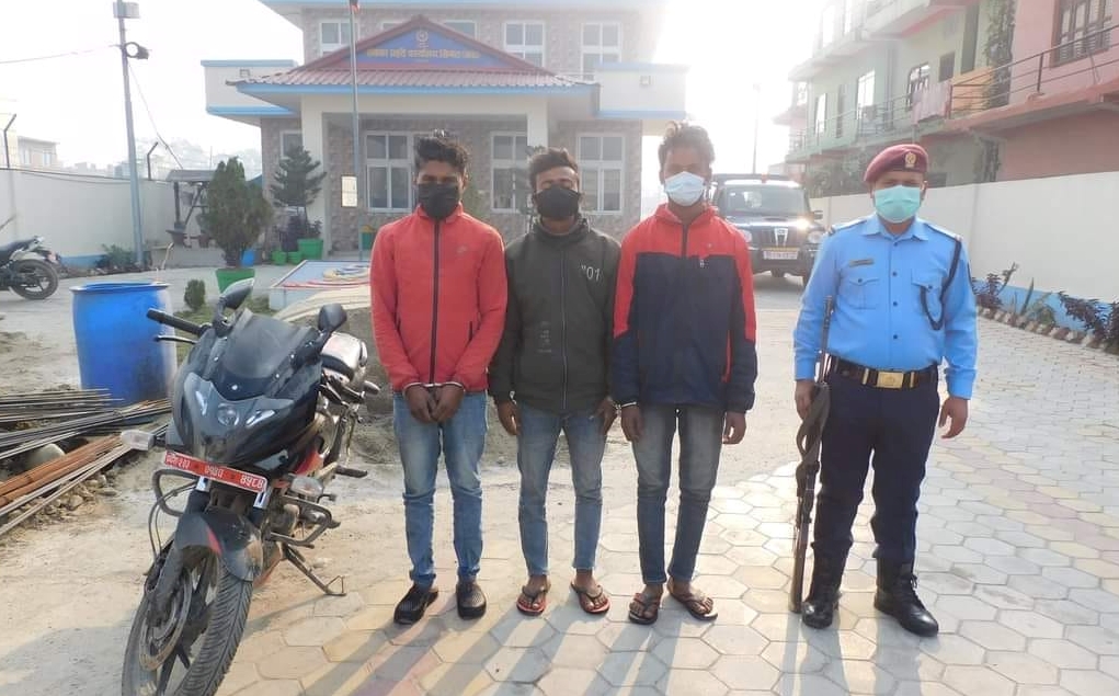 जीतपुरसिमरा उप-महानगरपालिकाकाे वडा नं.०७ स्थितबाट फागुन २ गते साेमबार राती ९:४५ बजे चोरी भई हराएको प्रदेश न.२-०३-०१४ प. ४५८४ न.को मोटरसाईकल खोजतलास गर्ने क्रममा जीतपुरसिमरा उप-महानगरपालिका कै वडा नं.०९ स्थित छातापिपरा चोकबाट साे माेटरसाइकलसहित तिनै जनालाई पक्राउ गरिएकाे प्रहरीले जनाएकाे छ ।