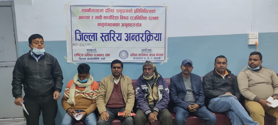 राष्ट्रिय दलित पत्रकार संघ पर्साका अध्यक्ष श्याम पासवानको अध्यक्षतामा भएको कार्यक्रमको सहजीकरण राष्ट्रिय दलित पत्रकार संघ पर्साका सचिव सूर्यनारायण वि.क.ले गरेका थिए ।