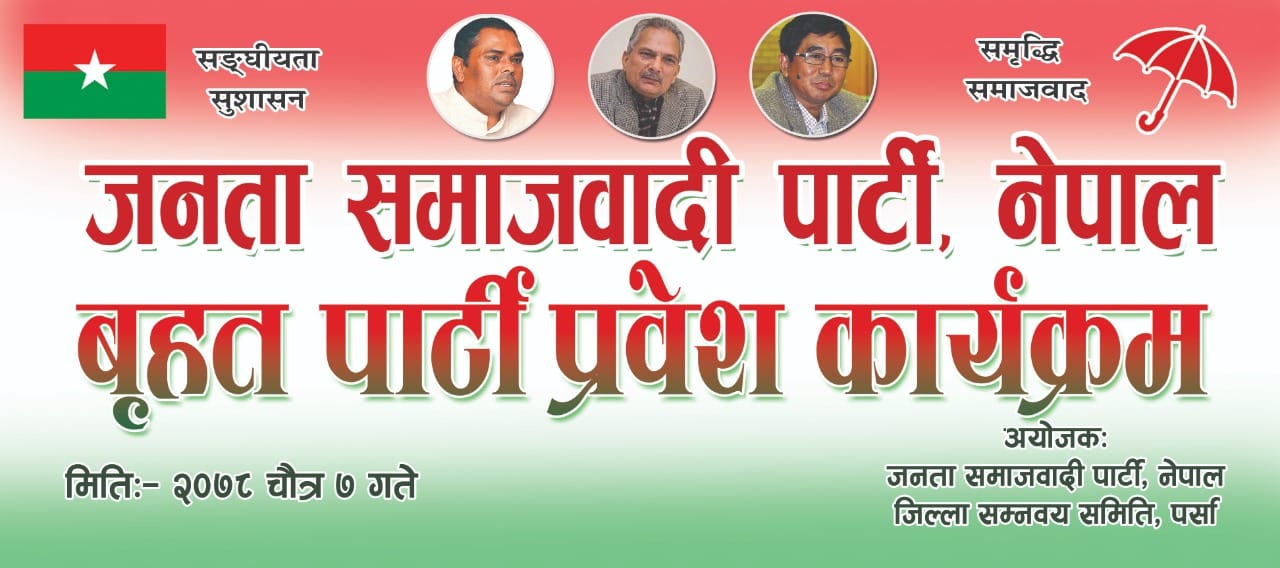 वीरगंज । पर्साकाे सदरमुकाम वीरगंज र पाेखरियामा साेमबार जनता समाजबादी पार्टी (जसपा) काे बृहत पार्टी प्रबेश कार्यक्रम हुने भएकाे छ । जसपाकाे जिल्ला समन्वय समिति पर्साकाे आयाेजनामा वीरगंजमा र पर्सा क्षेत्र नम्बर ३ काे आयाेजनामा पोखरियामा चैत्र ७ गते सोमबार आमसभा तथा बृहत पार्टी प्रवेश कार्यक्रम हुन लागेकाे हाे ।