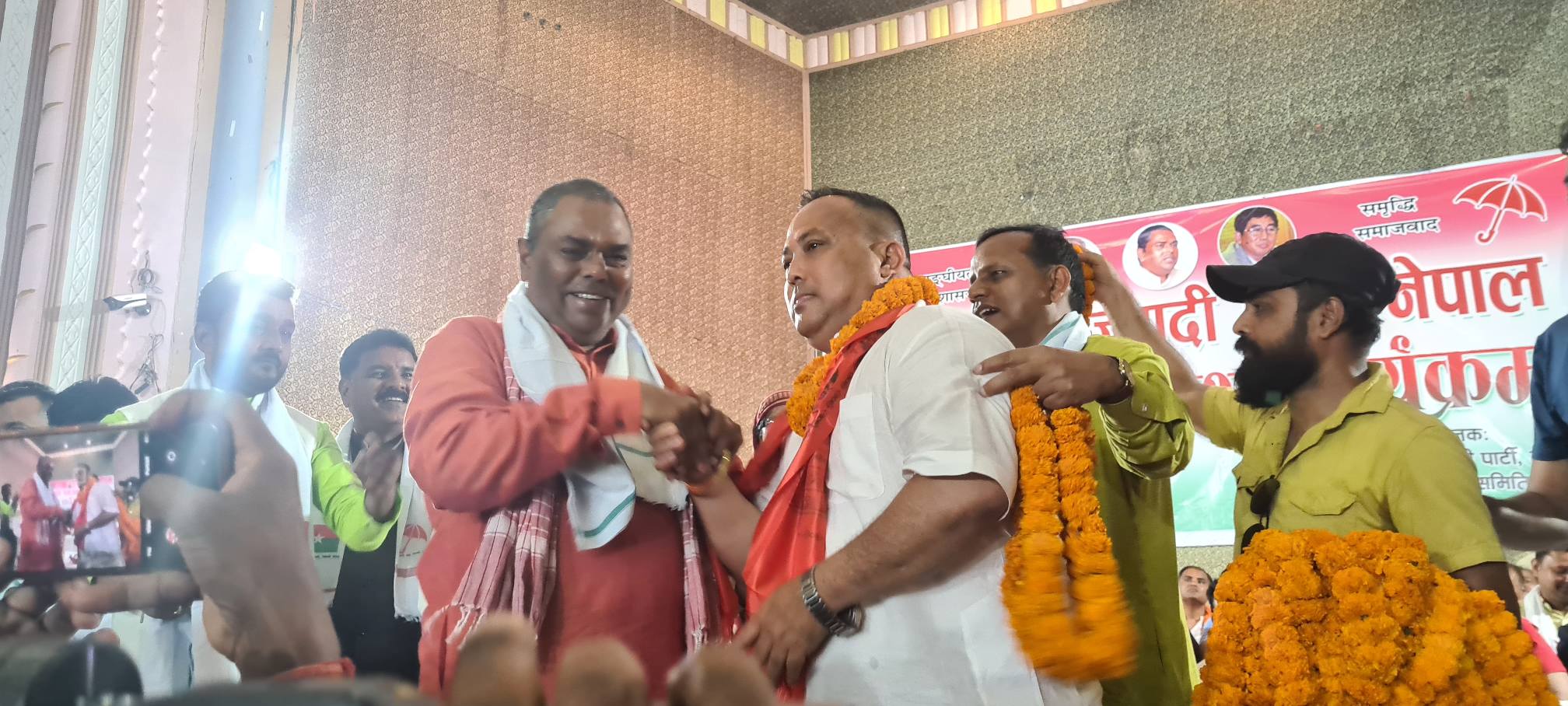 वीरगंज । नेकपा एमाले प्रबेश गर्ने घाेषणा गरेका लोकतान्त्रिक समाजवादी पार्टी (लोसपा) का नेता राजेशमान सिंह साेमबार जनता समाजवादी पार्टी (जसपा) प्रवेश गरेका छन् । वीरगंजस्थित नगर सभा गृहमा आयाेजित पार्टी प्रबेश कार्यक्रम मार्फत जसपाका संघिय परिषद अध्यक्ष डा. बाबुराम भट्टराई र केन्द्रिय अध्यक्ष उपेन्द्र यादवले नेता सिंहलाई पार्टी प्रबेश गराएका छन् ।