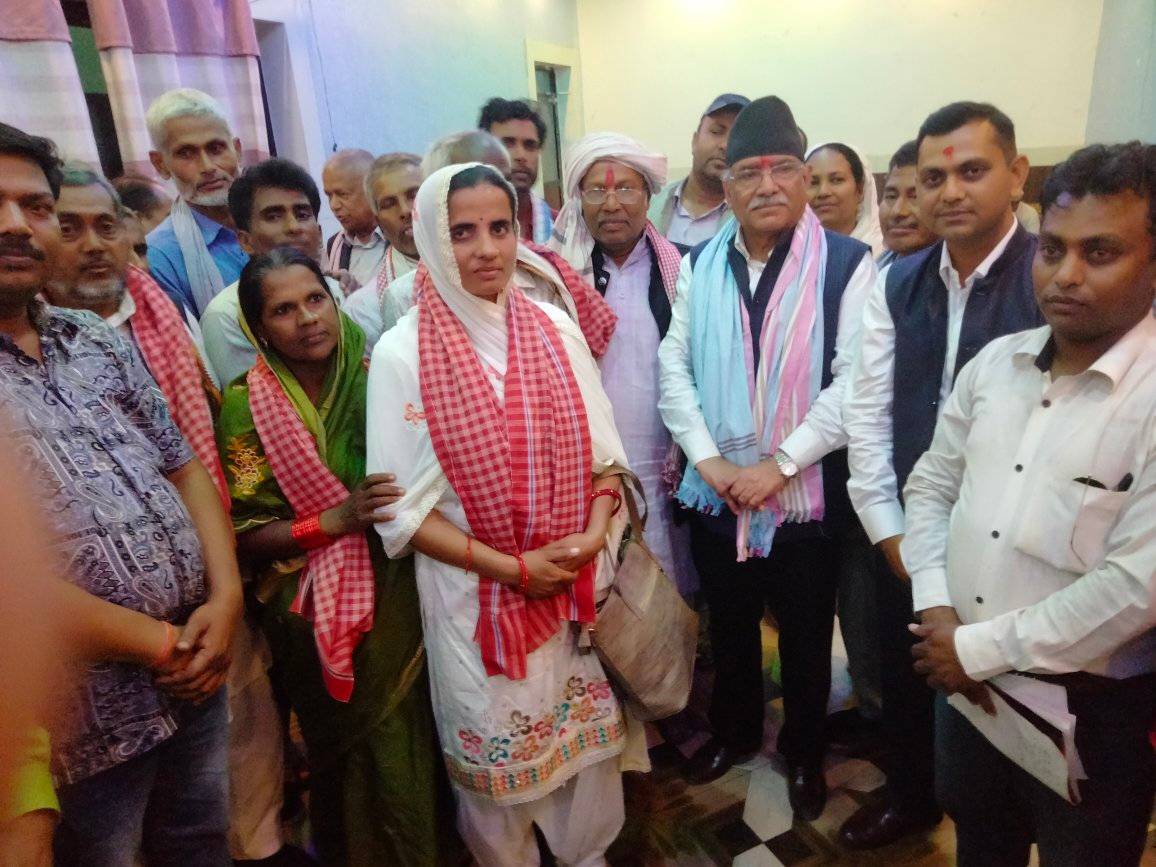 नव प्रदेशी सबै जनालाई बद्रीबासस्थित दिपक पार्टी प्यालेसमा आयाेजिक एक कार्यक्रममा माओवादी केन्द्रका अध्यक्ष पुष्प कमल दहाल (प्रचण्ड) ले गमछा ओढाएर र अबिरकाे टिका लगाएर पार्टीमा स्वागत गरेका थिए ।